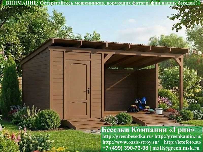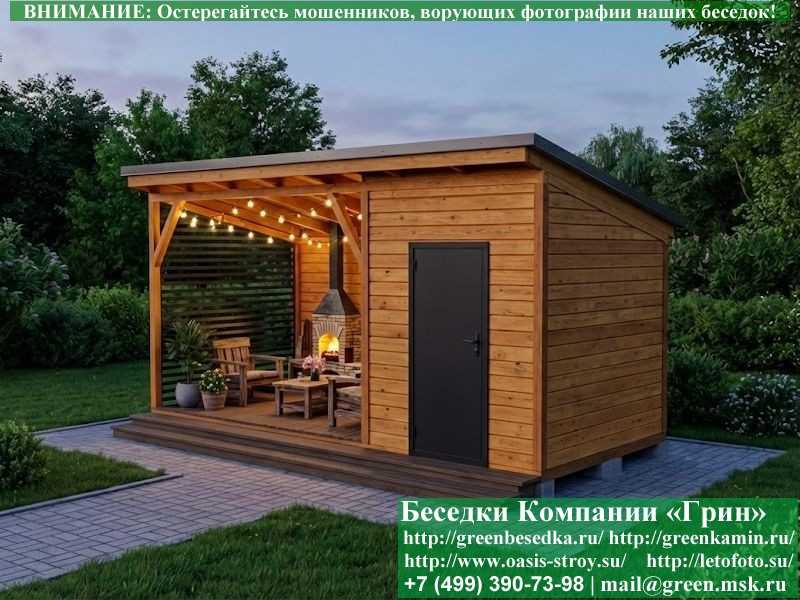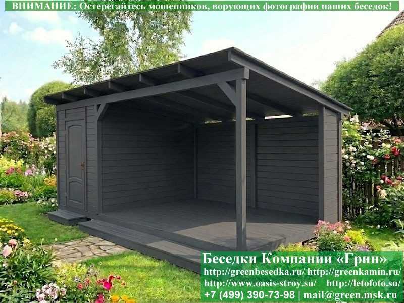 Беседка в стиле 'Лофт' 3х5, 3х6 метров изготавливается из сосны, с односкатной крышей. При строительстве беседок используется сухой материал камерной сушки. Беседка разделена на 2 части. Хозблок 2х3 метра. Открытая веранда 3х3 или 3х4 метра. Возможно изменить конфигурацию. Сделать хозблок 3х3 метра Беседка устанавливается на фундаментные блоки 20х20х40 см. Они включены в цену. Их можно дополнительно заменить на металлические сваи. На пол кладется толстая сухая строганая доска 35 мм. В качестве несущих стоек используется строганый брус 90х90 мм. В качестве каркаса глухих стен используется очень надежная имитация бруса 17х140 мм. На крышу укладывается мягкая гибкая черепица "Технониколь": коричневых, зеленых, бордовых, серых цветов. Мягкую черепицу можно заменить ее на металлочерепицу или профлист. Срок изготовления и установки беседки на участке составляет 5-10 дней. Беседки поставляются в не крашеном виде. Возможна покраска беседок или дополнительная обработка антисептиком. Дополнительно предлагаем установку в деревянные беседки 'Лофт' недорогих безопасных быстровозводимых печей-барбекю, установка в течение дня, или более дорогих и сложных комплексов-барбекю и мангалов-барбекю из кирпича.