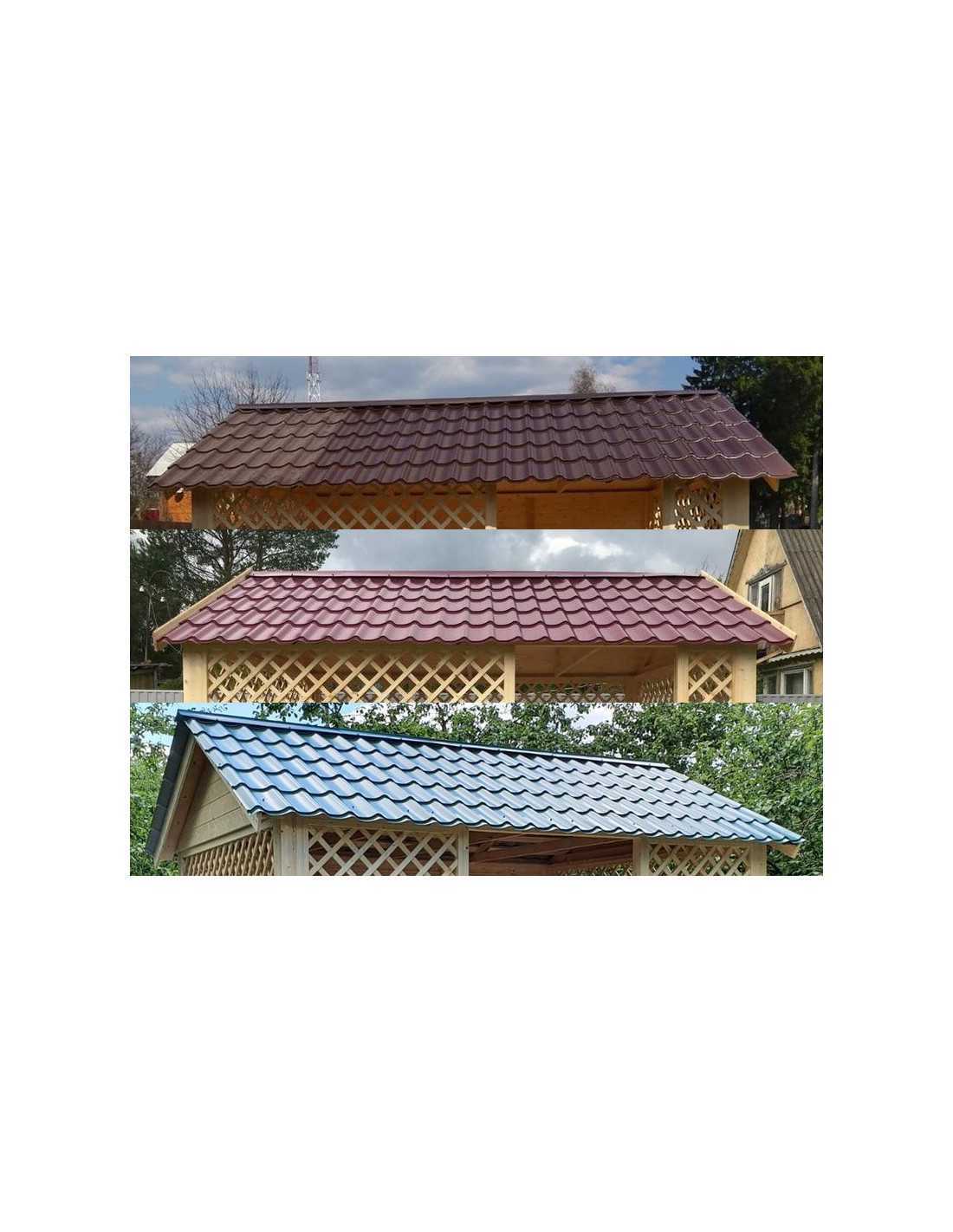 В стандартной поставке в виде кровли на крышу беседок, бытовок, хозблоков 4х4 метра кладется ондулин (мягкий шифер). Вы можете дополнительно заменить его на более надежную металлочерепицу.
