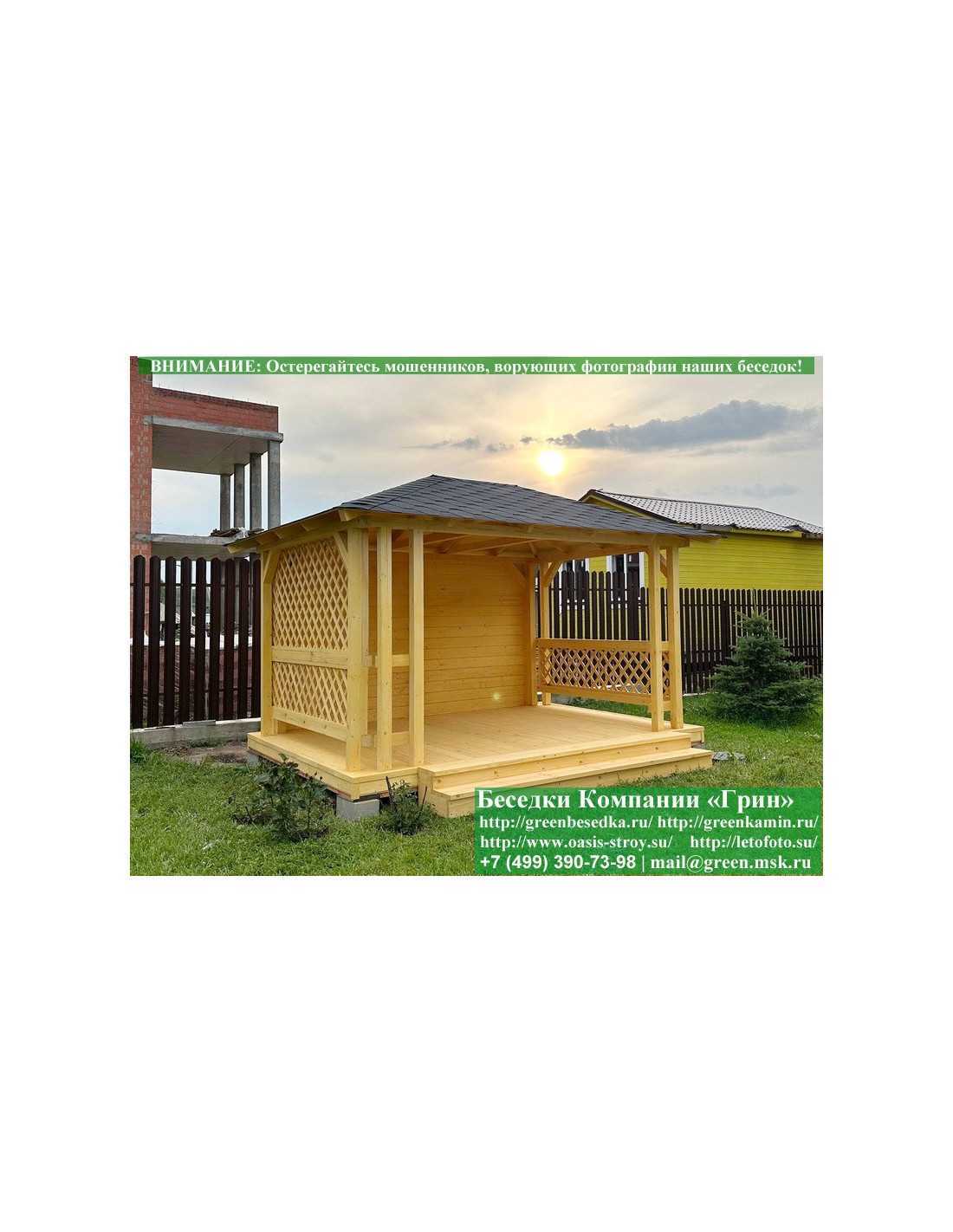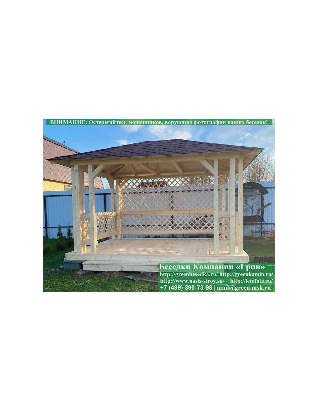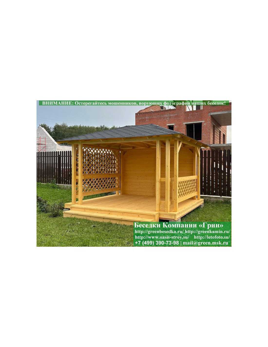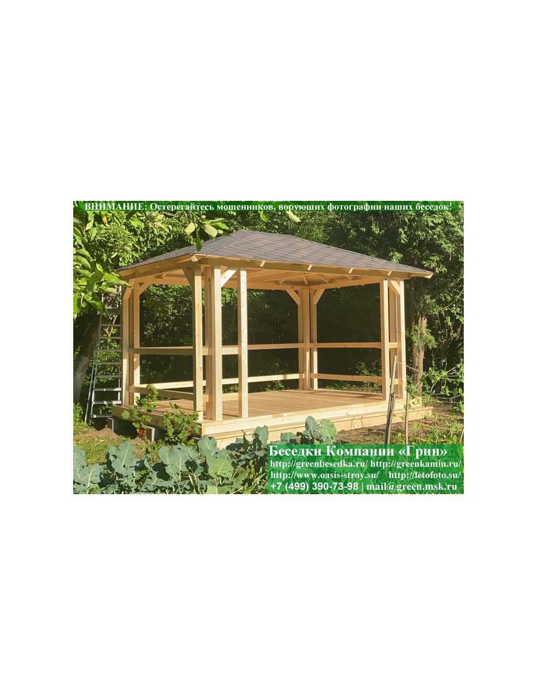 Удобная летняя деревянная беседка для дачи, загородного дома с широким входом 3х4 метра. Фото и цены. В интернет-магазине 'Грин Камин' вы можете купить практичную летнюю беседку из дерева с широким входом для дачи, сада 3х4 под ключ с монтажом в Ярославле и Ярославской области. Изготовление и строительство красивых деревянных летних беседок по готовым проектам размерами 3х4 метра возможно так же в Москве, Московской, Калужской, Тверской, Владимирской, Тульской, Ивановской, Брянской, Костромской, Орловской, Рязанской, Новгородской, Липецкой, Ленинградской и некоторых других областях.