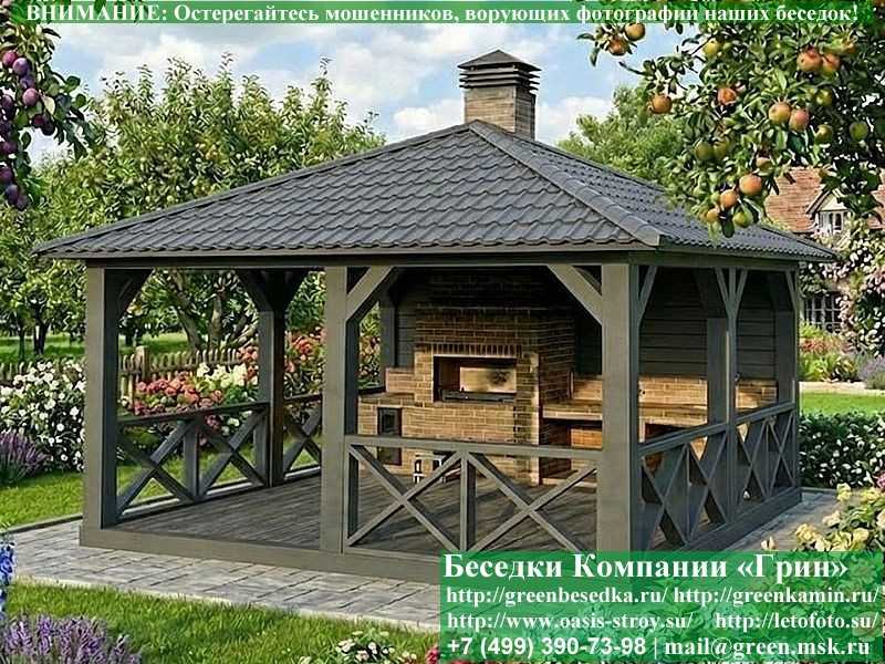 Элегантная летняя деревянная беседка для дачи, загородного дома с мангалом-барбекю 4х5 метров. Фото и цены. В интернет-магазине 'Грин Камин' вы можете купить красивую летнюю беседку из дерева для дачи, сада, отдыха с печкой-барбекю 4х5 под ключ с монтажом в Костроме и Костромской области. Изготовление и строительство полезных летних деревянных беседок по готовым проектам с комплексом-барбекю размерами 4х5 метров возможно так же в Москве, Московской, Тульской, Калужской, Брянской, Владимирской, Ярославской, Рязанской, Ивановской, Орловской, Тверской, Новгородской, Липецкой, Ленинградской и некоторых других областях.