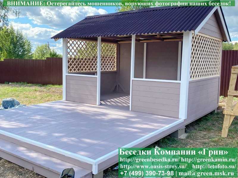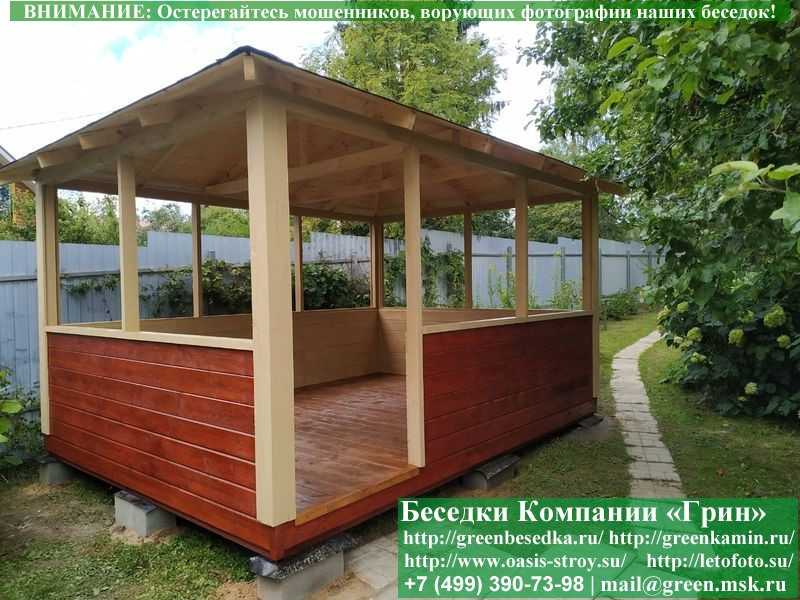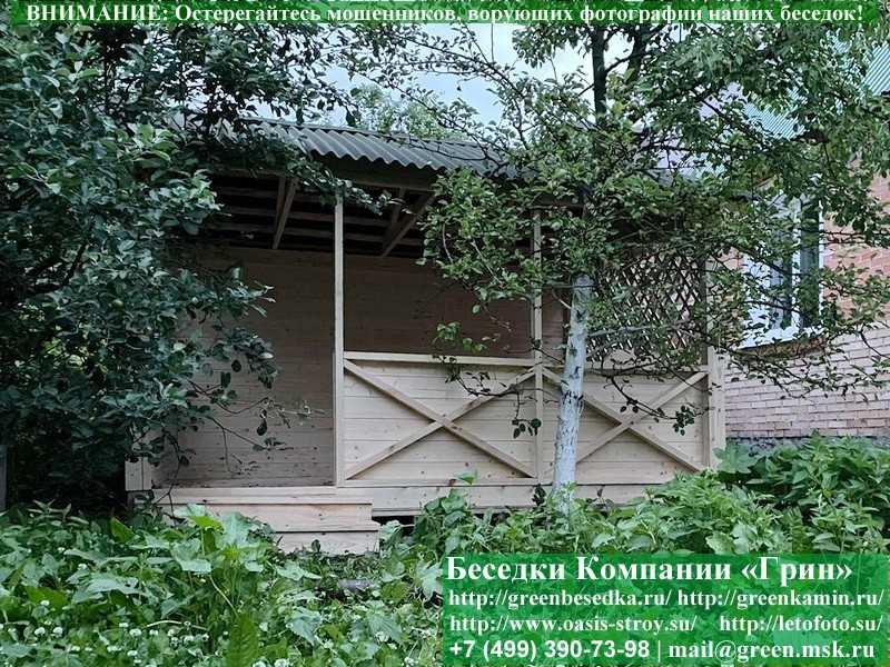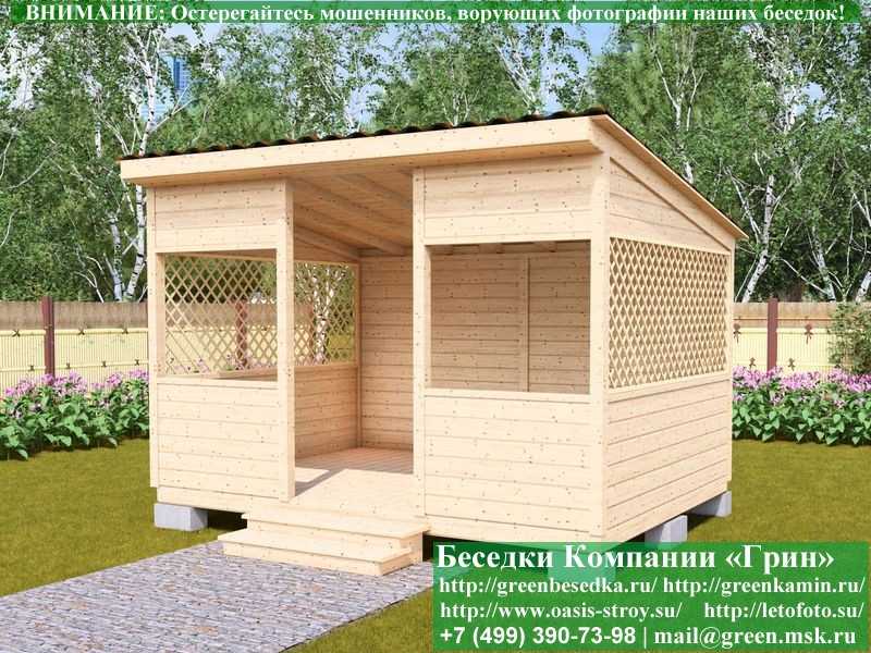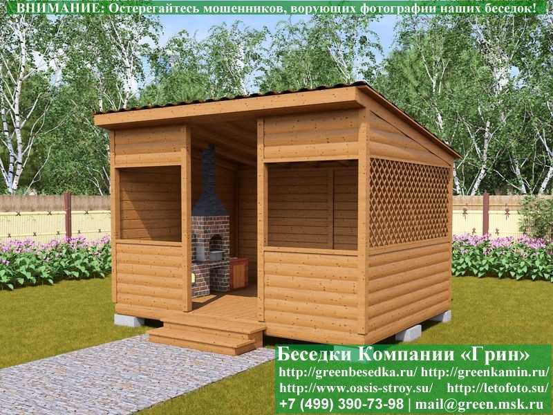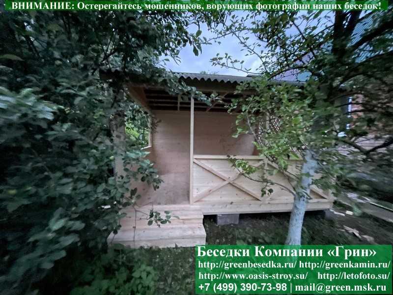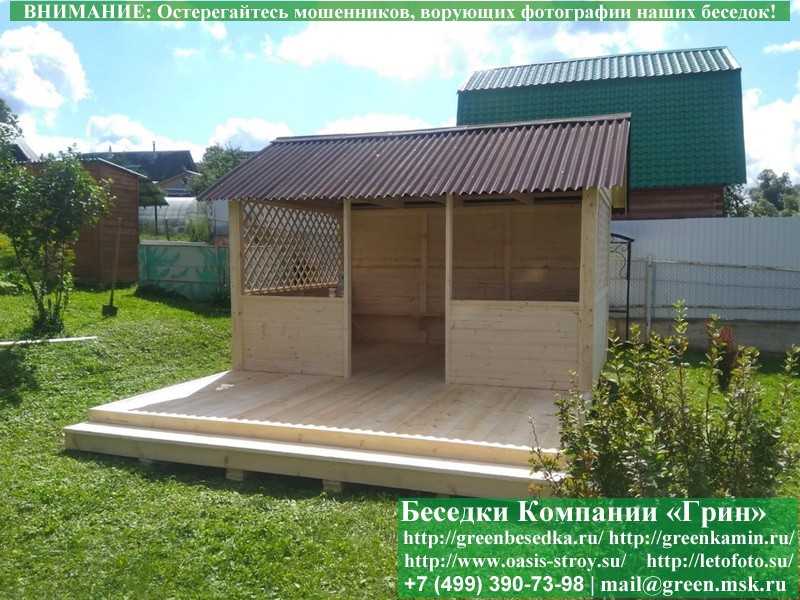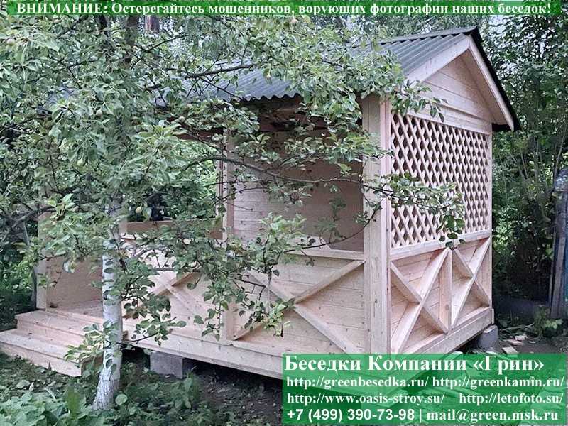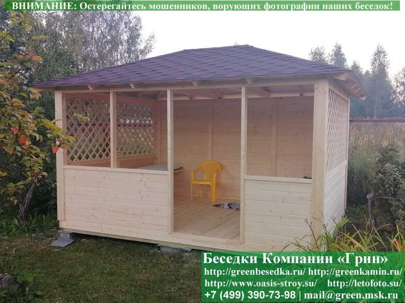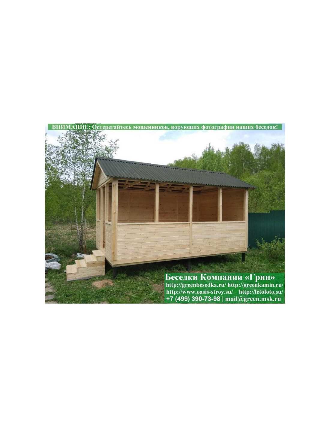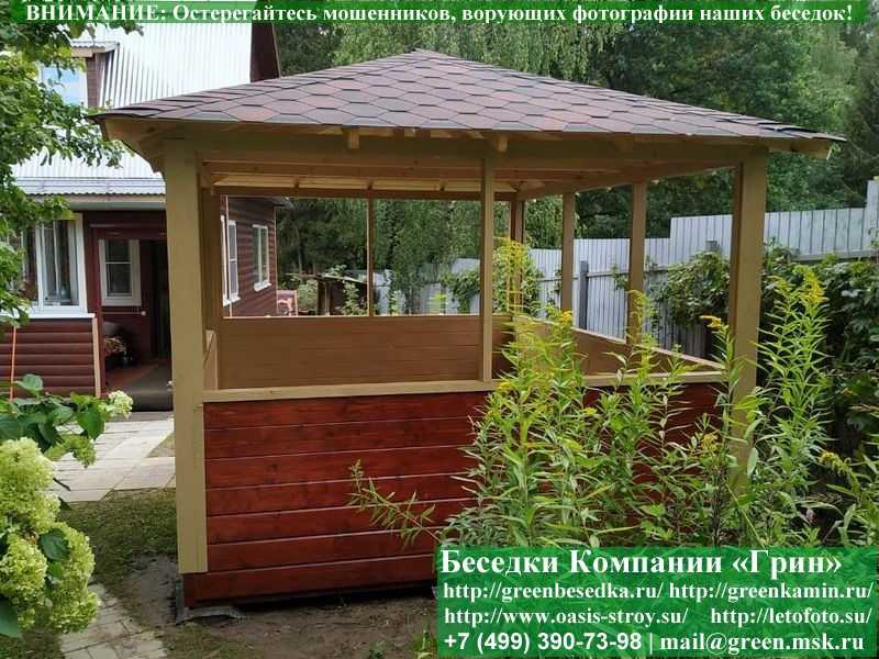 Садовая беседка для дачи 'Домик 3х4' изготавливается из сосны. При строительстве беседок используется сухой материал камерной сушки. В качестве каркаса используется очень надежная имитация бруса 17х140 мм. В отличие от вагонки, ее не выгибает, она не набухает и не идет трещинами. Усиленная конструкция крепления стенок. В качестве несущих стоек используется строганый брус. По углам 90х90 мм. Выше подоконника устанавливаются перголы (решетки) с косыми ячейками. Перголы закупаются у мастера, который занимается их изготовлением 15 лет. Сухой материал тщательно полируется. На пол кладется толстая сухая строганая доска 35 мм. На крышу беседки укладывается ондулин (мягкий шифер): Коричневых, Зеленых, Бордовых, Серых цветов. Срок изготовления и монтажа беседки на участке составляет 5-10 дней. Беседки поставляются в не крашеном виде. Возможна покраска беседок в цеху краской, лаком или полная обработка антисептиком. Дополнительно предлагаем установку в деревянные беседки 'Домик' недорогих безопасных быстровозводимых печей-барбекю, установка в течение дня, или более дорогих и сложных комплексов-барбекю и мангалов-барбекю из кирпича.