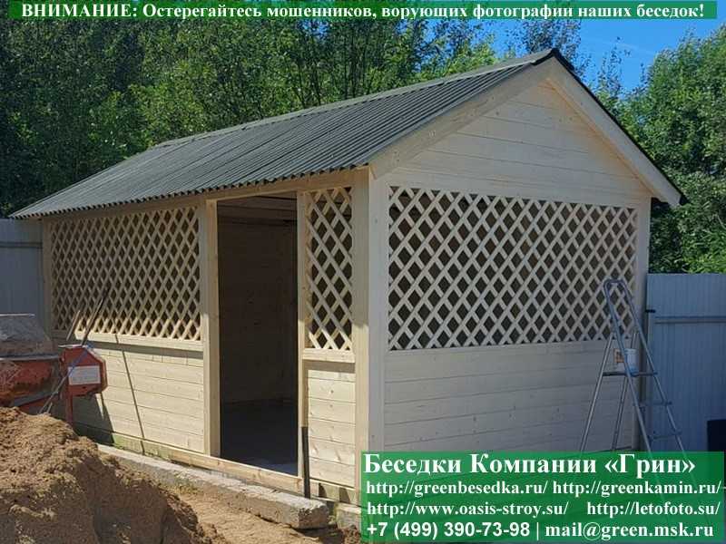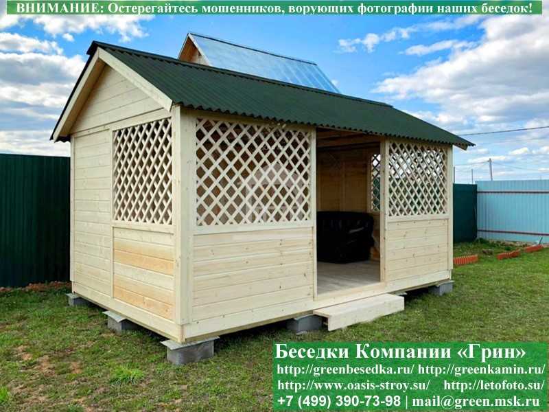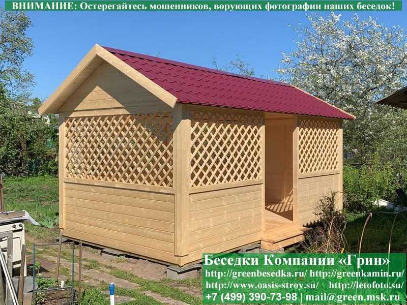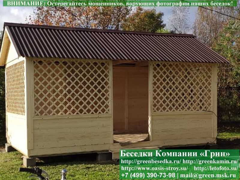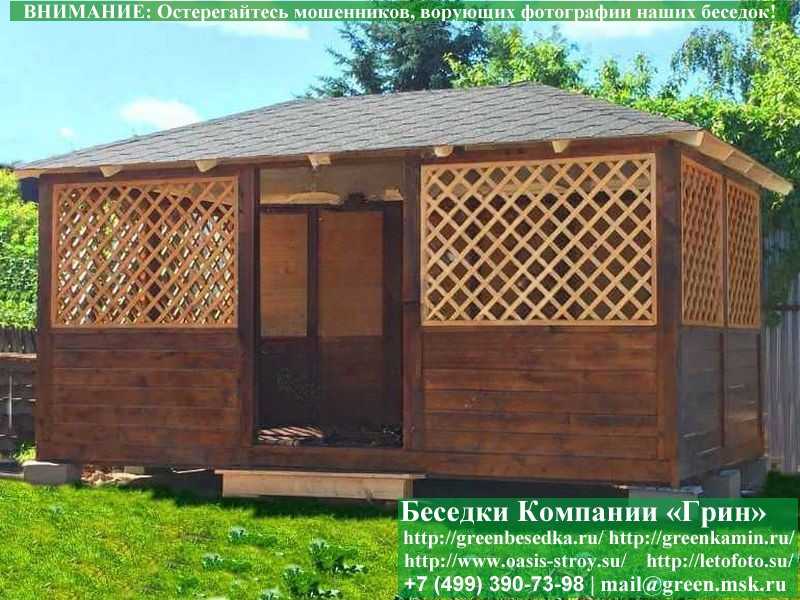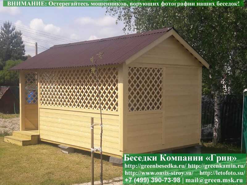 Садовая беседка для дачи 'Домик 3х5' изготавливается из сосны. При строительстве беседок используется сухой материал камерной сушки. В качестве каркаса используется очень надежная имитация бруса 17х140 мм. В отличие от вагонки, ее не выгибает, она не набухает и не идет трещинами. Усиленная конструкция крепления стенок. В качестве несущих стоек используется строганый брус. По углам ставится дополнительный брус 90х90 мм. Выше подоконника устанавливаются перголы (решетки) с косыми ячейками. Перголы закупаются у мастера, который занимается их изготовлением 15 лет. Сухой материал тщательно полируется. На пол кладется толстая сухая строганая доска 35 мм. На крышу беседки укладывается ондулин (мягкий шифер): Коричневых, Зеленых, Бордовых, Серых цветов. Срок изготовления и монтажа беседки на участке составляет 5-10 дней. Беседки поставляются в не крашеном виде. Возможна покраска беседок в цеху краской, лаком или полная обработка антисептиком. Дополнительно предлагаем установку в деревянные беседки 'Домик' недорогих безопасных быстровозводимых печей-барбекю, установка в течение дня, или более дорогих и сложных комплексов-барбекю и мангалов-барбекю из кирпича.