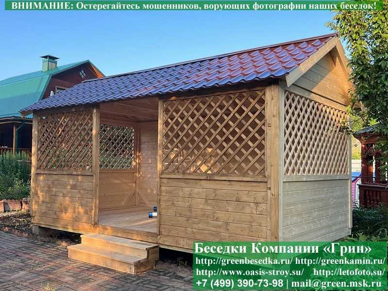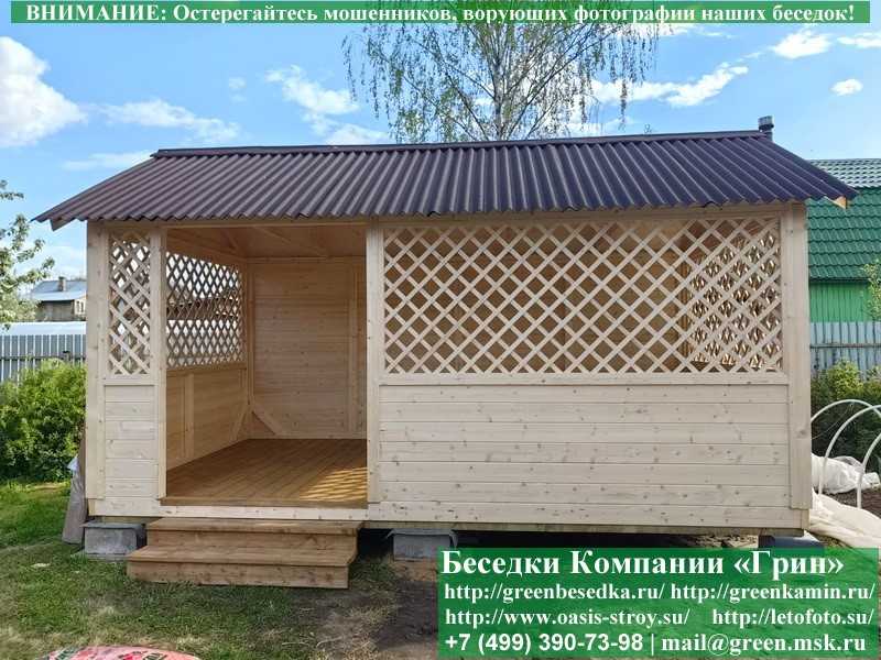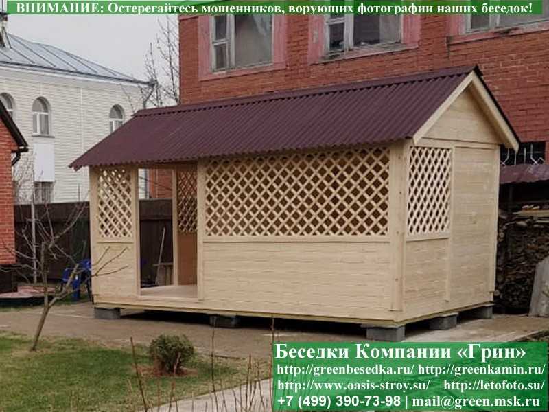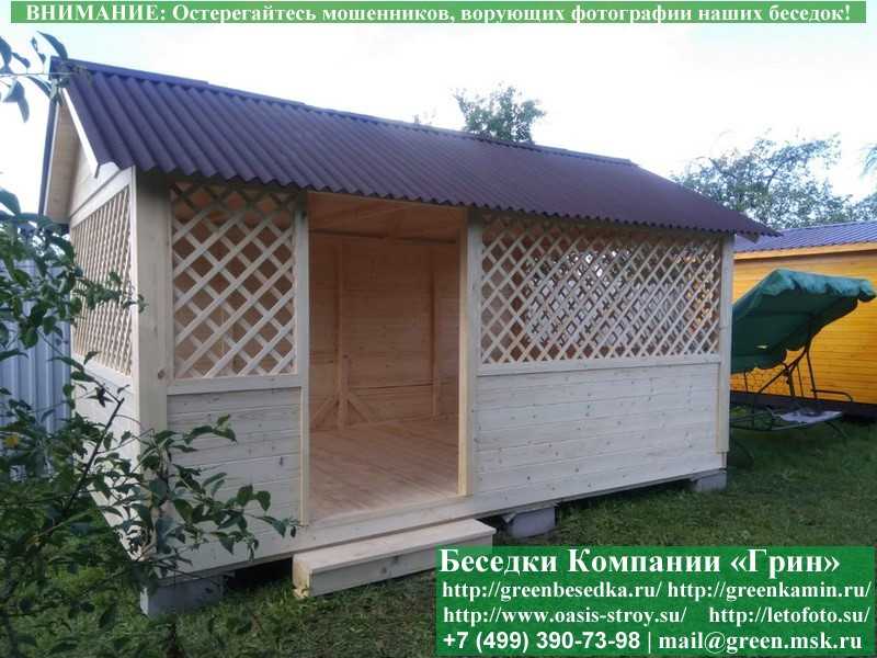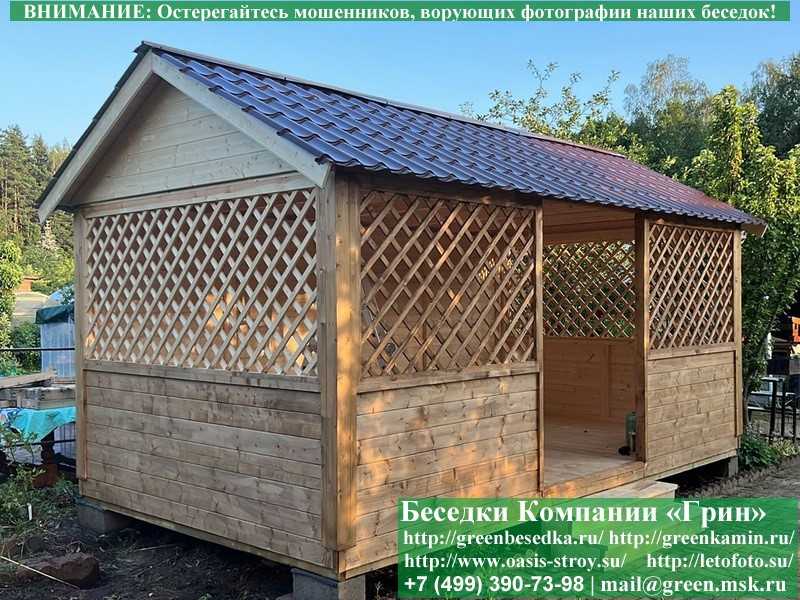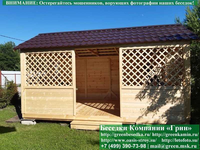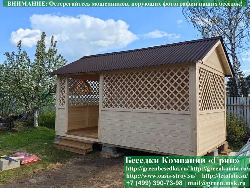 Садовая беседка для дачи 'Домик 3х5' изготавливается из сосны. При строительстве беседок используется сухой материал камерной сушки. В качестве каркаса используется очень надежная имитация бруса 17х140 мм. В отличие от вагонки, ее не выгибает, она не набухает и не идет трещинами. Усиленная конструкция крепления стенок. В качестве несущих стоек используется строганый брус. По углам ставится дополнительный брус 90х90 мм. Выше подоконника устанавливаются перголы (решетки) с косыми ячейками. Перголы закупаются у мастера, который занимается их изготовлением 15 лет. Сухой материал тщательно полируется. На пол кладется толстая сухая строганая доска 35 мм. На крышу беседки укладывается ондулин (мягкий шифер): Коричневых, Зеленых, Бордовых, Серых цветов. Срок изготовления и монтажа беседки на участке составляет 5-10 дней. Беседки поставляются в не крашеном виде. Возможна покраска беседок в цеху краской, лаком или полная обработка антисептиком. Дополнительно предлагаем установку в деревянные беседки 'Домик' недорогих безопасных быстровозводимых печей-барбекю, установка в течение дня, или более дорогих и сложных комплексов-барбекю и мангалов-барбекю из кирпича.