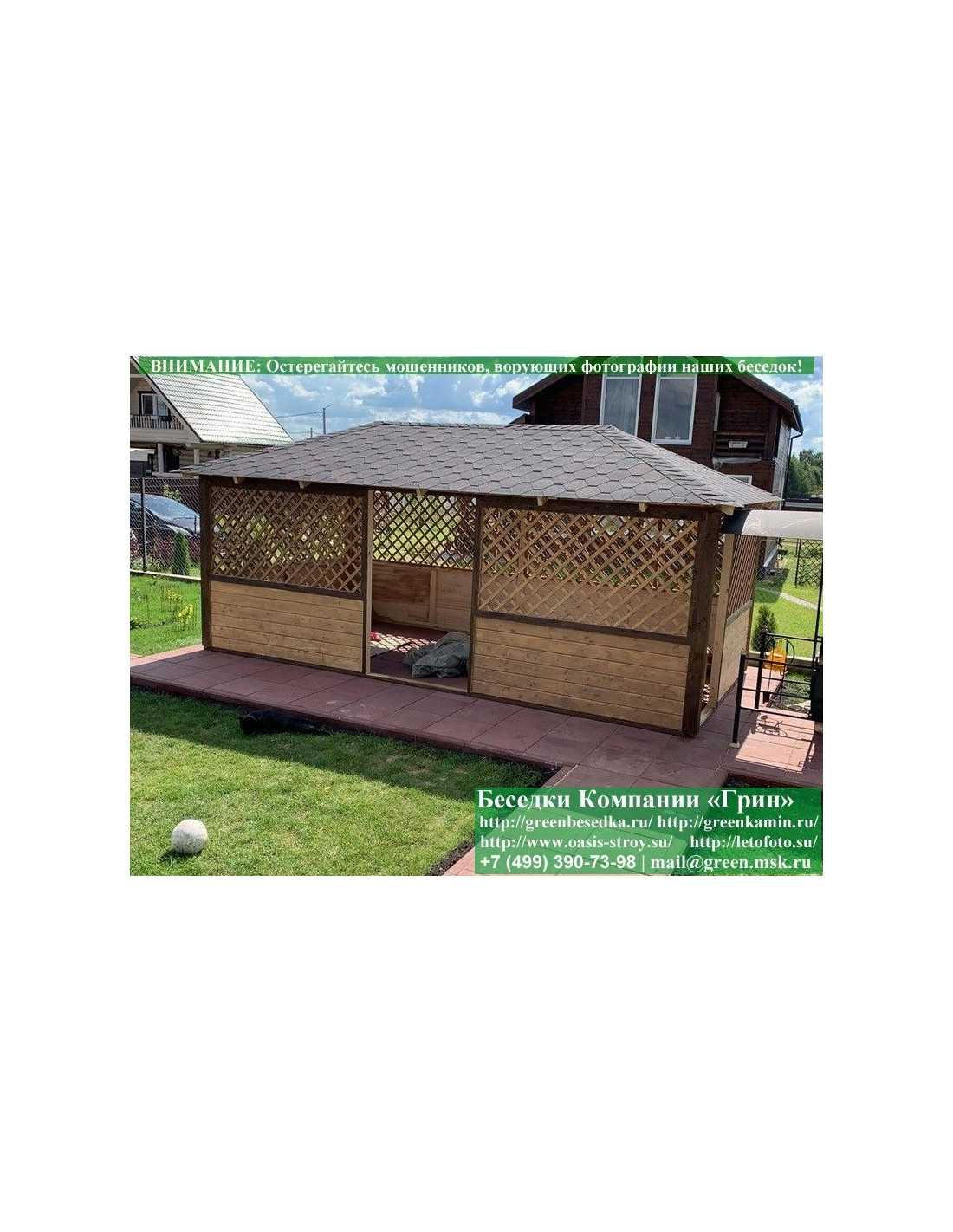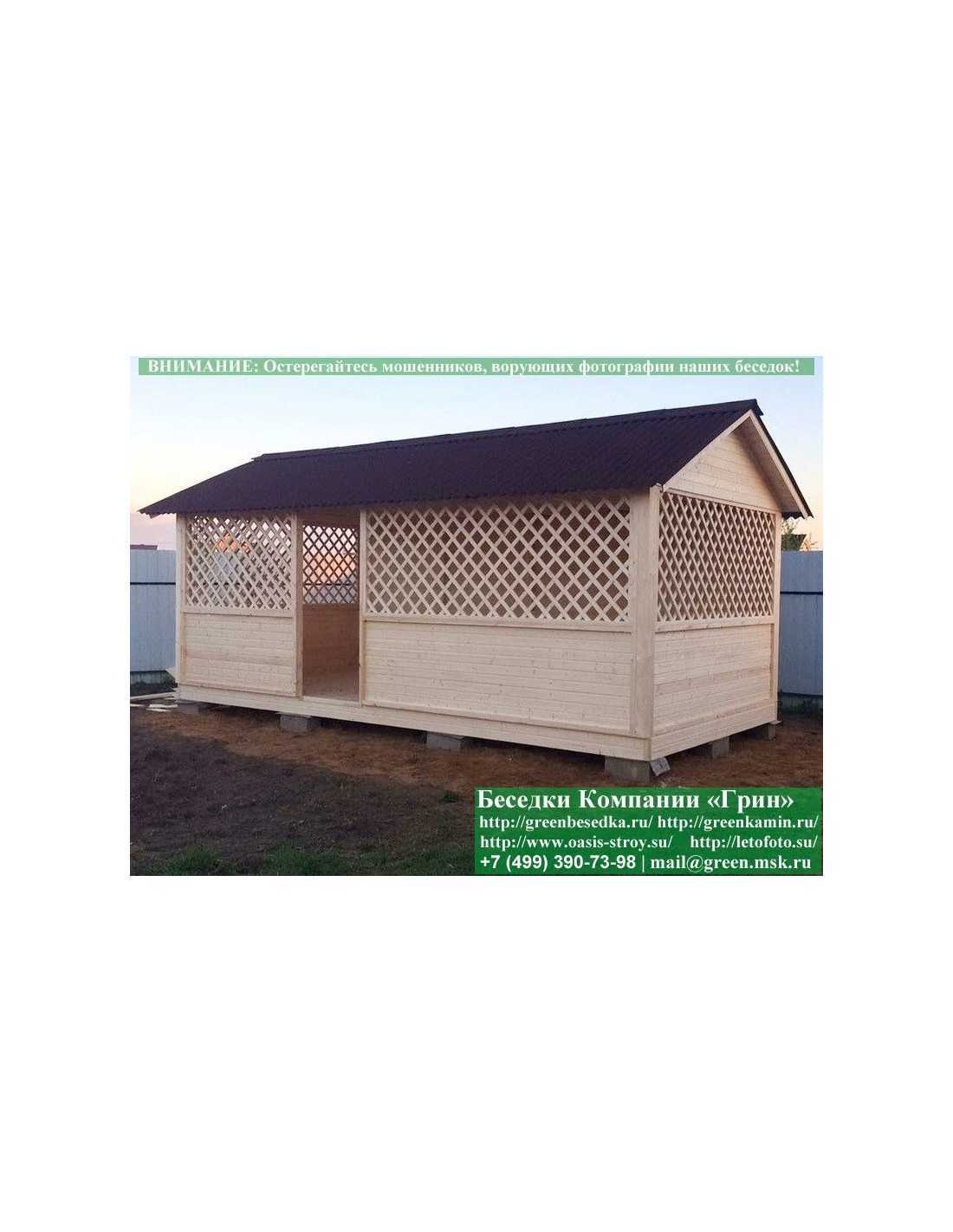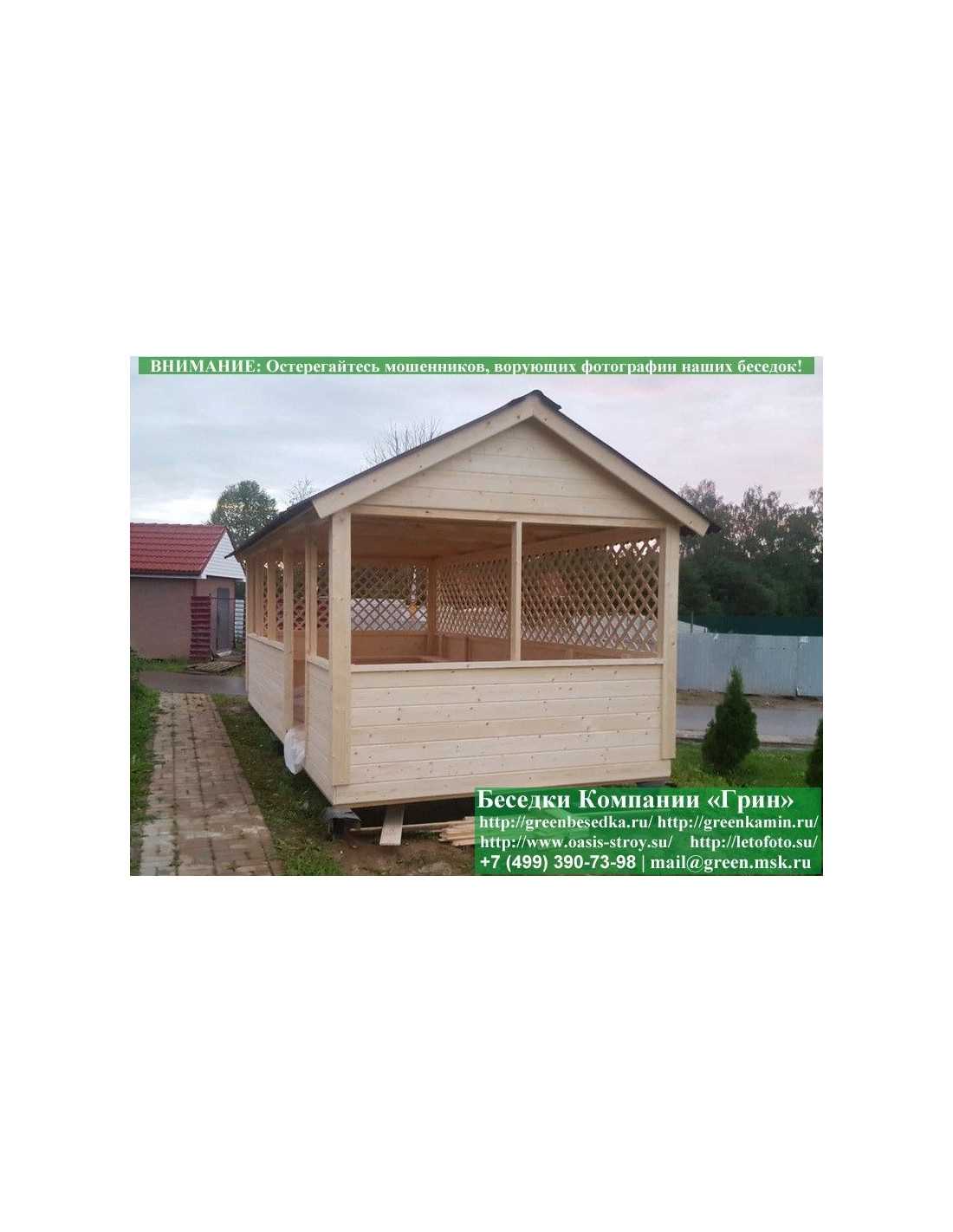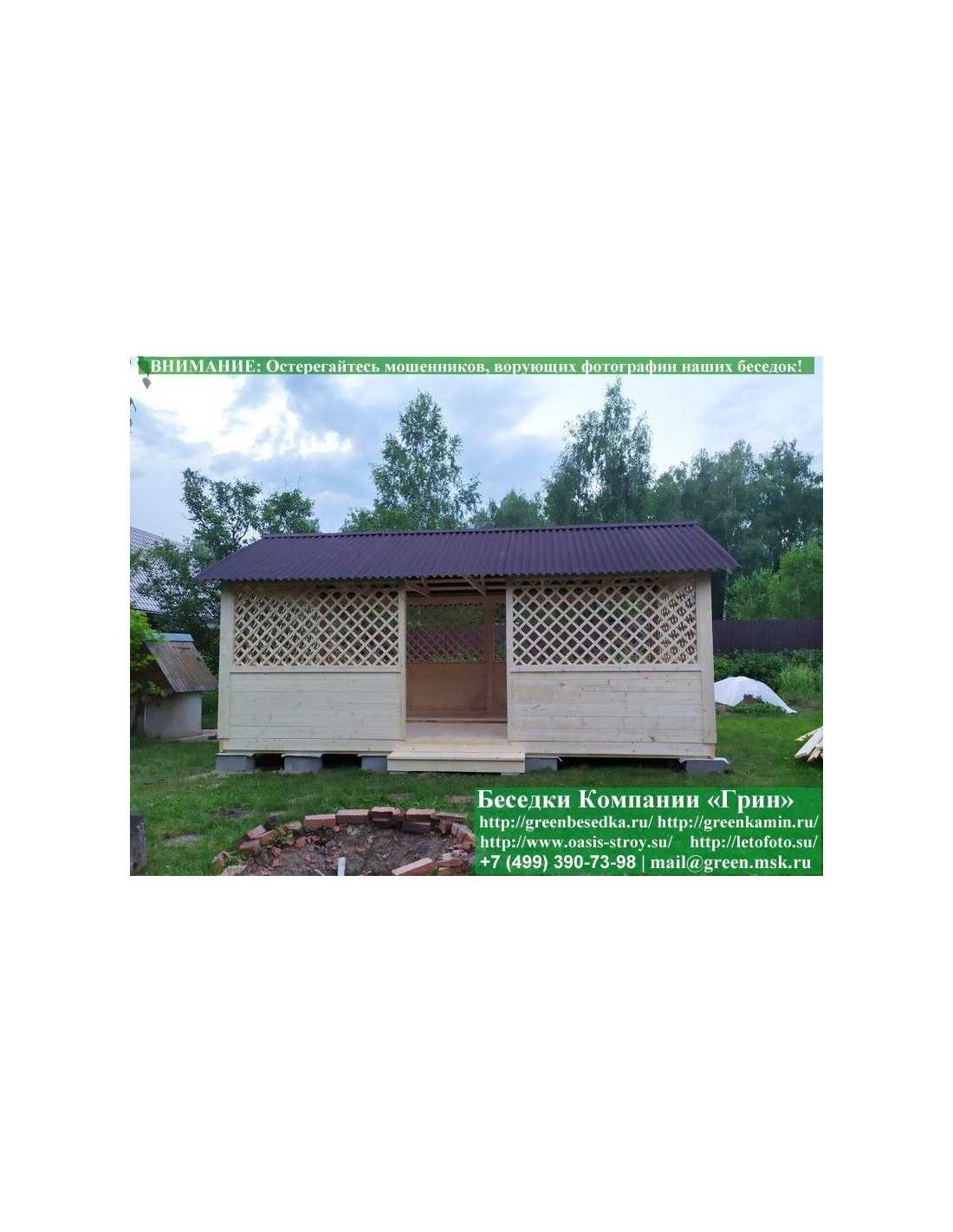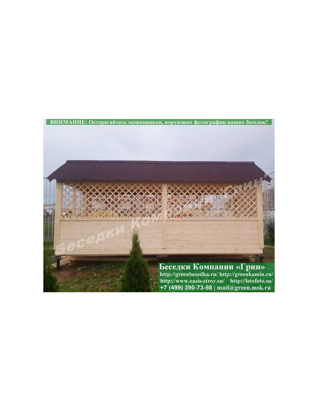 Садовая беседка для дачи 'Домик 3х6' изготавливается из сосны. При строительстве беседок используется сухой материал камерной сушки. В качестве каркаса используется очень надежная имитация бруса 17х140 мм. В отличие от вагонки, ее не выгибает, она не набухает и не идет трещинами. Усиленная конструкция крепления стенок. В качестве несущих стоек используется строганый брус. По углам ставится дополнительный брус 90х90 мм. Выше подоконника устанавливаются перголы (решетки) с косыми ячейками. Перголы закупаются у мастера, который занимается их изготовлением 15 лет. Сухой материал тщательно полируется. На пол кладется толстая сухая строганая доска 35 мм. На крышу беседки укладывается ондулин (мягкий шифер): Коричневых, Зеленых, Бордовых, Серых цветов. Срок изготовления и монтажа беседки на участке составляет 5-10 дней. Беседки поставляются в не крашеном виде. Возможна покраска беседок в цеху краской, лаком или полная обработка антисептиком. Дополнительно предлагаем установку в деревянные беседки 'Домик' недорогих безопасных быстровозводимых печей-барбекю, установка в течение дня, или более дорогих и сложных комплексов-барбекю и мангалов-барбекю из кирпича.