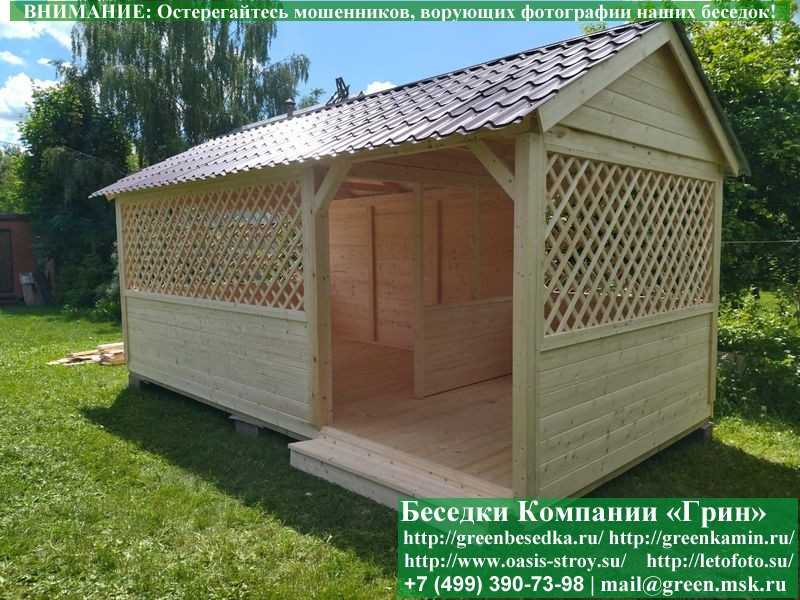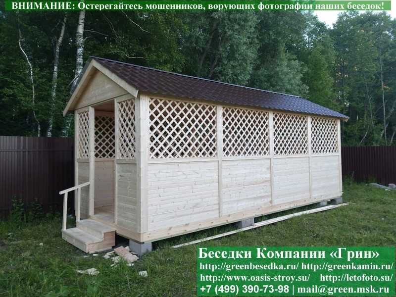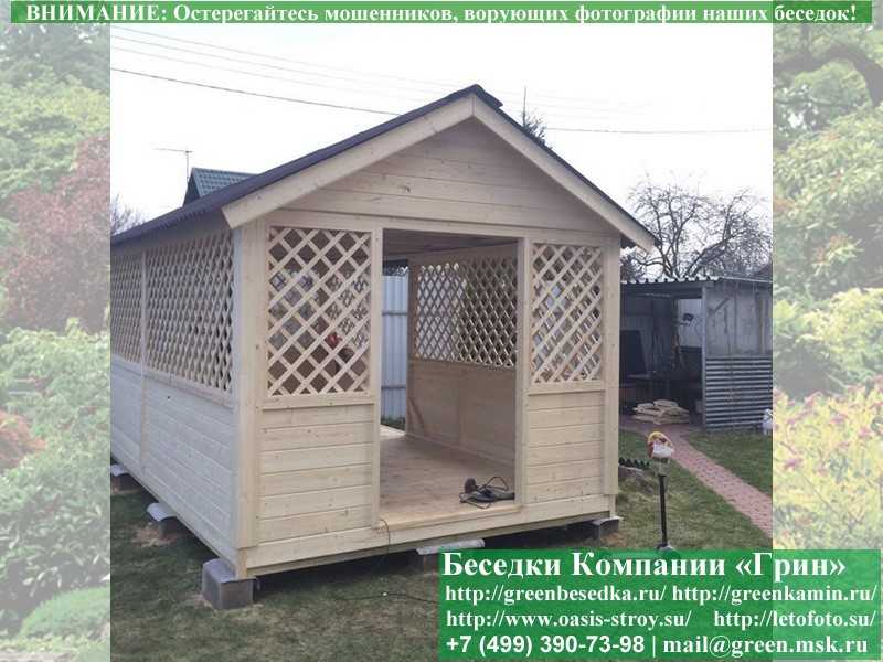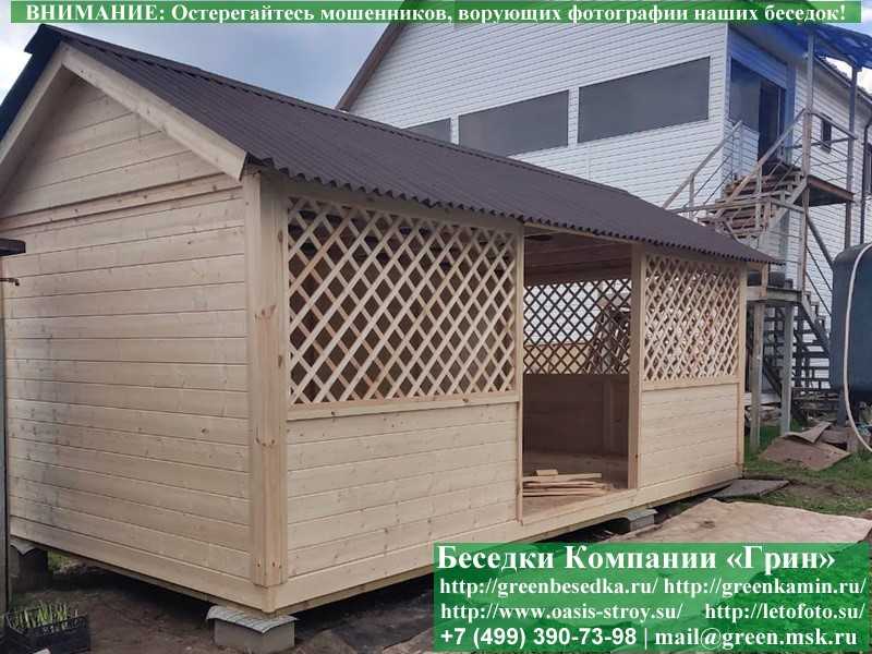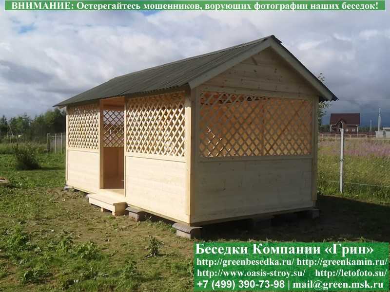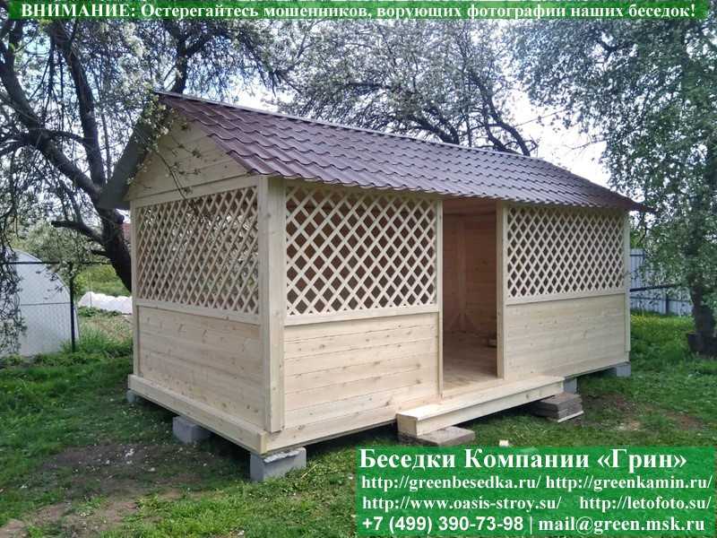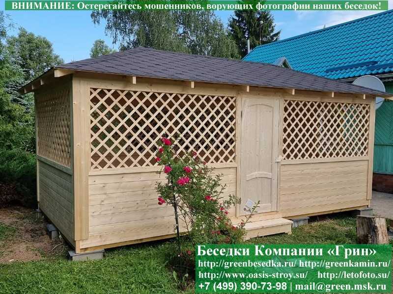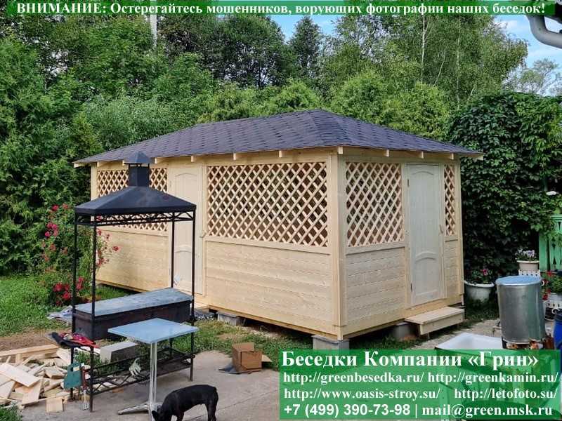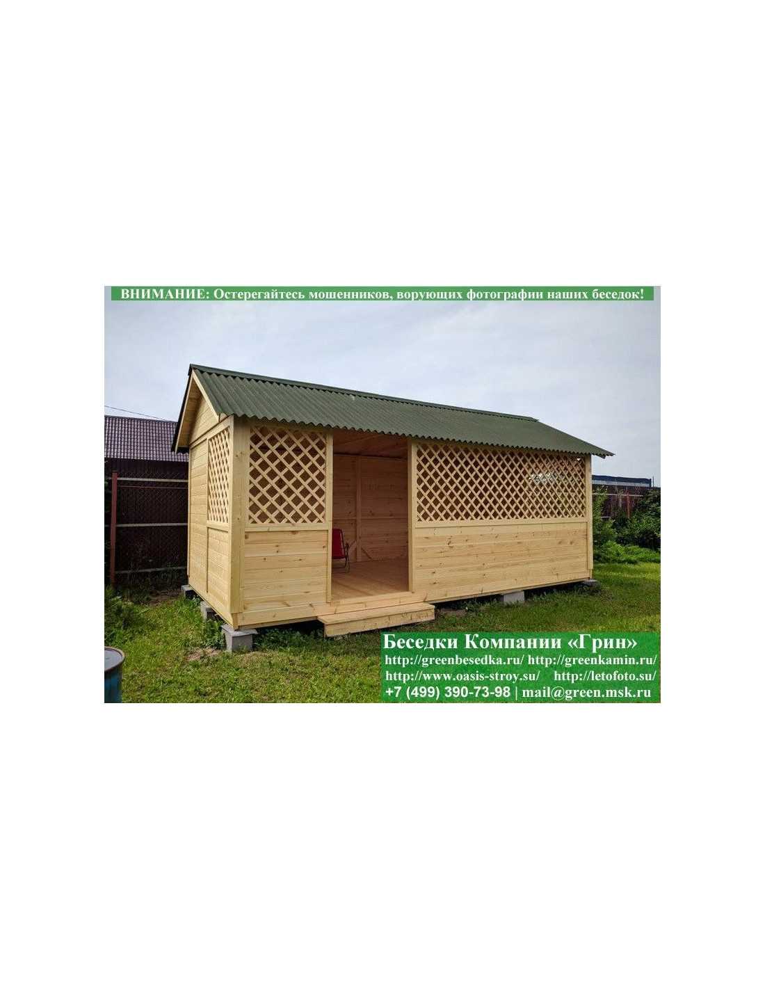 Садовая беседка для дачи 'Домик 3х6' изготавливается из сосны. При строительстве беседок используется сухой материал камерной сушки. В качестве каркаса используется очень надежная имитация бруса 17х140 мм. В отличие от вагонки, ее не выгибает, она не набухает и не идет трещинами. Усиленная конструкция крепления стенок. В качестве несущих стоек используется строганый брус. По углам ставится дополнительный брус 90х90 мм. Выше подоконника устанавливаются перголы (решетки) с косыми ячейками. Перголы закупаются у мастера, который занимается их изготовлением 15 лет. Сухой материал тщательно полируется. На пол кладется толстая сухая строганая доска 35 мм. На крышу беседки укладывается ондулин (мягкий шифер): Коричневых, Зеленых, Бордовых, Серых цветов. Срок изготовления и монтажа беседки на участке составляет 5-10 дней. Беседки поставляются в не крашеном виде. Возможна покраска беседок в цеху краской, лаком или полная обработка антисептиком. Дополнительно предлагаем установку в деревянные беседки 'Домик' недорогих безопасных быстровозводимых печей-барбекю, установка в течение дня, или более дорогих и сложных комплексов-барбекю и мангалов-барбекю из кирпича.