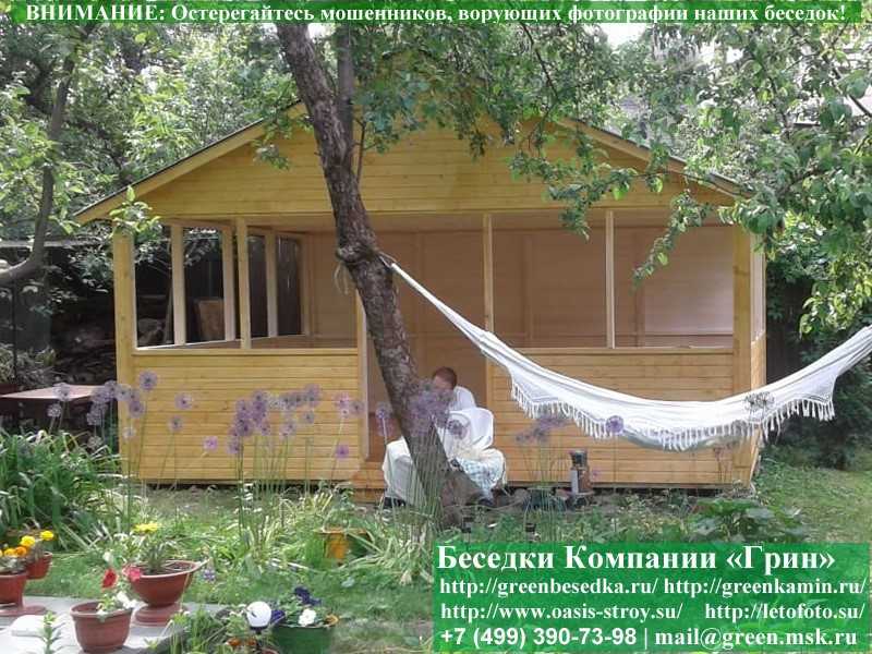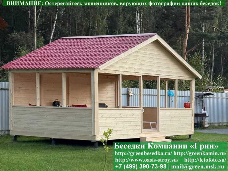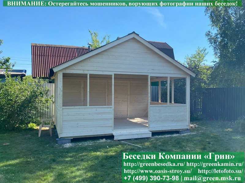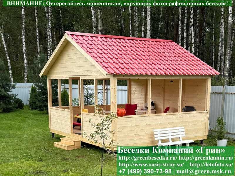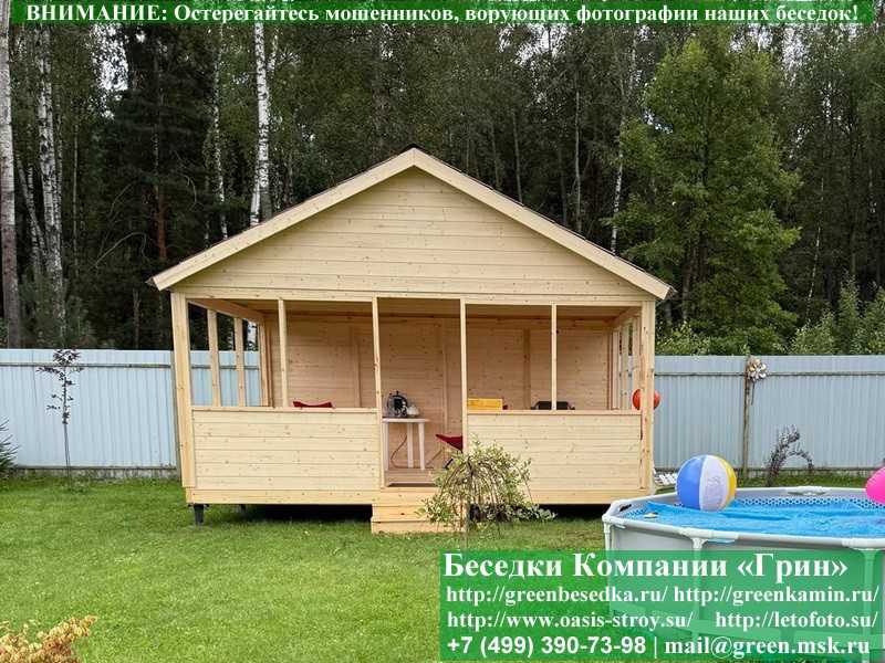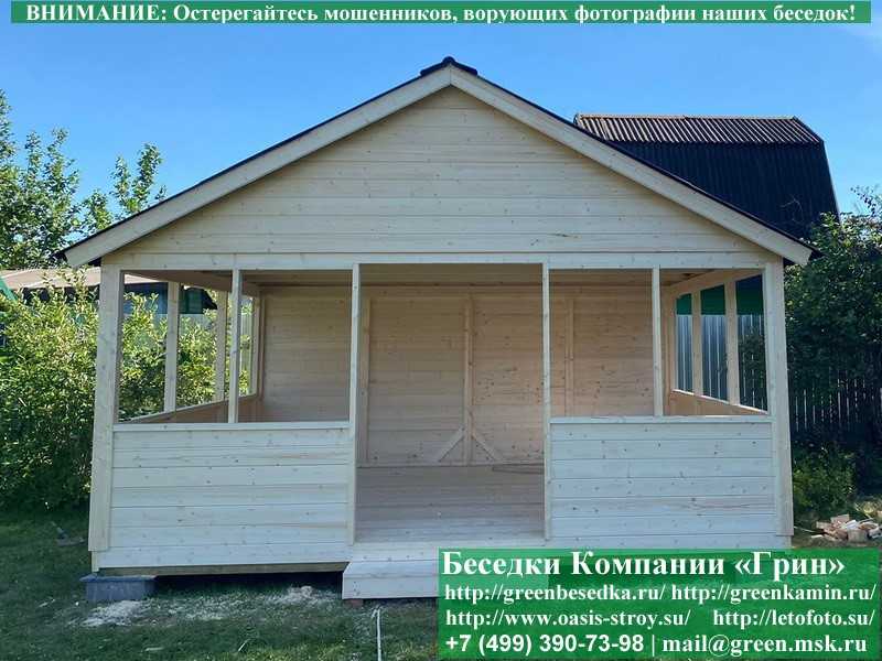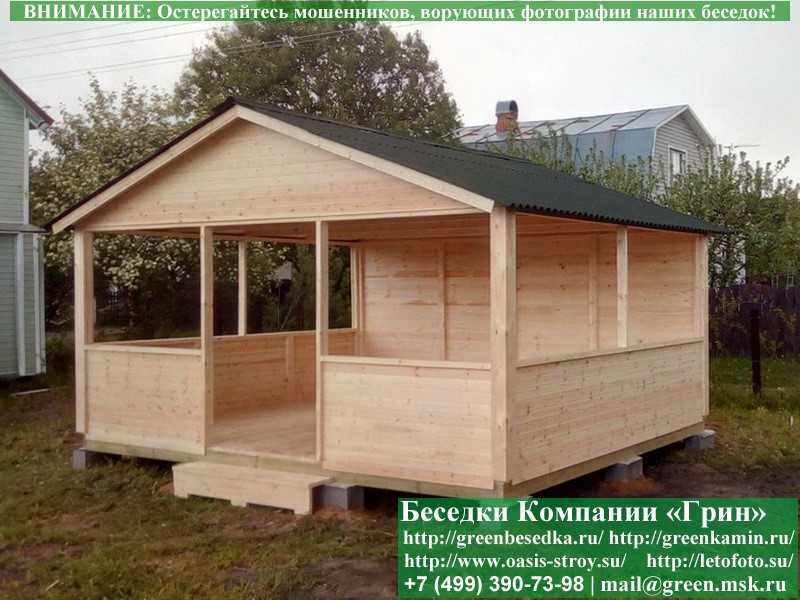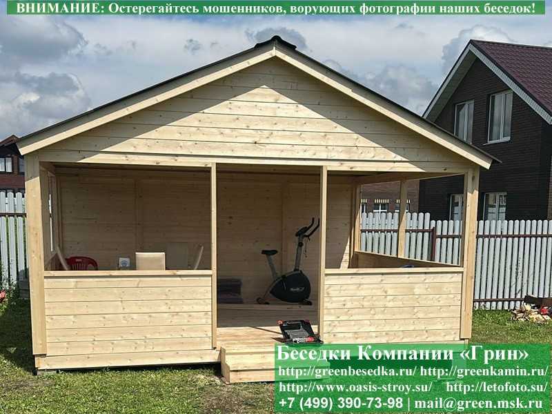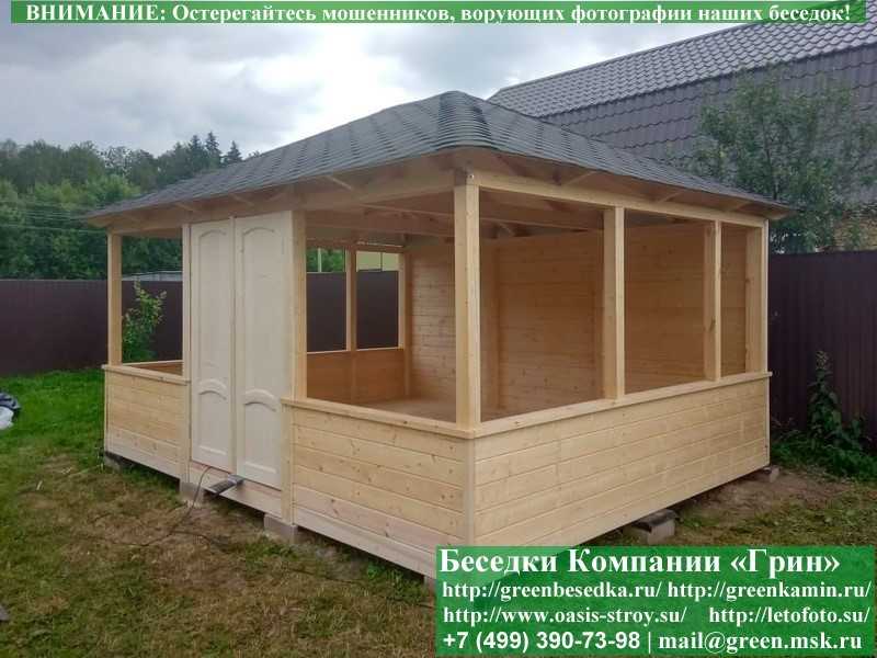 Садовая беседка для дачи 'Домик 4х5' изготавливается из сосны. Открытая беседка с глухой задней стенкой. При строительстве беседок используется сухой материал камерной сушки. В качестве каркаса используется очень надежная имитация бруса 17х140 мм. В отличие от вагонки, ее не выгибает, она не набухает и не идет трещинами. Усиленная конструкция крепления стенок. В качестве несущих стоек используется строганый брус. По углам ставится дополнительный брус 90х90 мм. На пол кладется толстая сухая строганая доска 35 мм. На крышу беседки укладывается ондулин (мягкий шифер): Коричневых, Зеленых, Бордовых, Серых цветов. Срок изготовления и монтажа беседки на участке составляет 5-10 дней. Беседки поставляются в не крашеном виде. Возможна покраска беседок в цеху краской, лаком или полная обработка антисептиком. Дополнительно предлагаем установку в деревянные беседки 'Домик' недорогих безопасных быстровозводимых печей-барбекю, установка в течение дня, или более дорогих и сложных комплексов-барбекю и мангалов-барбекю из кирпича.