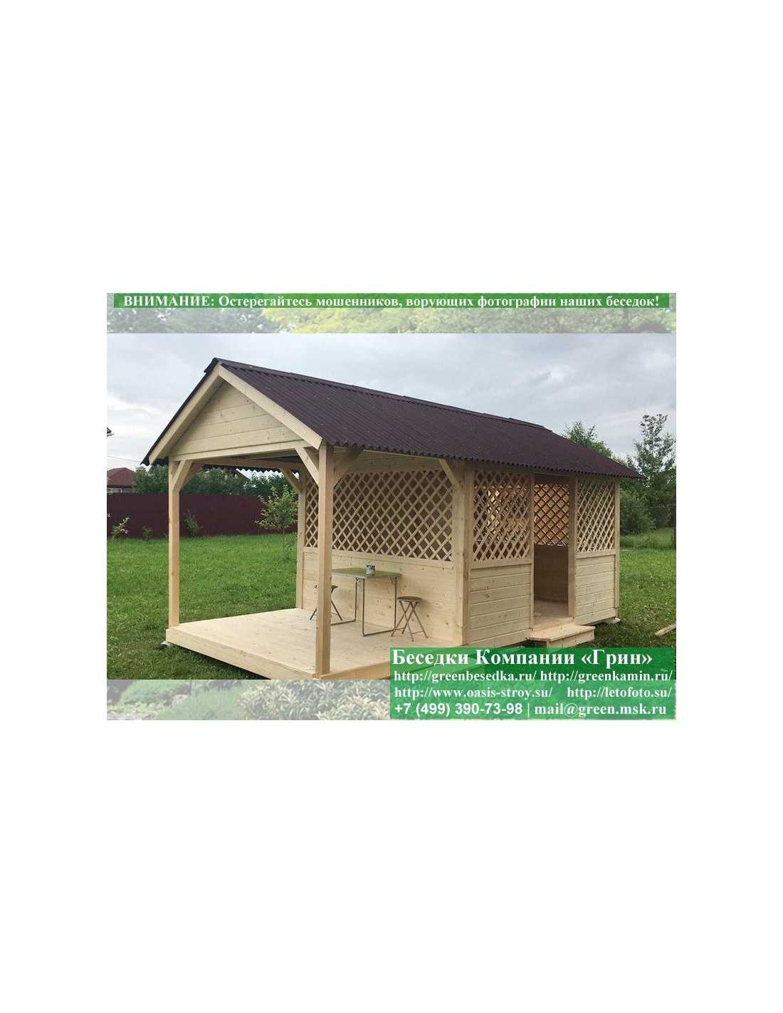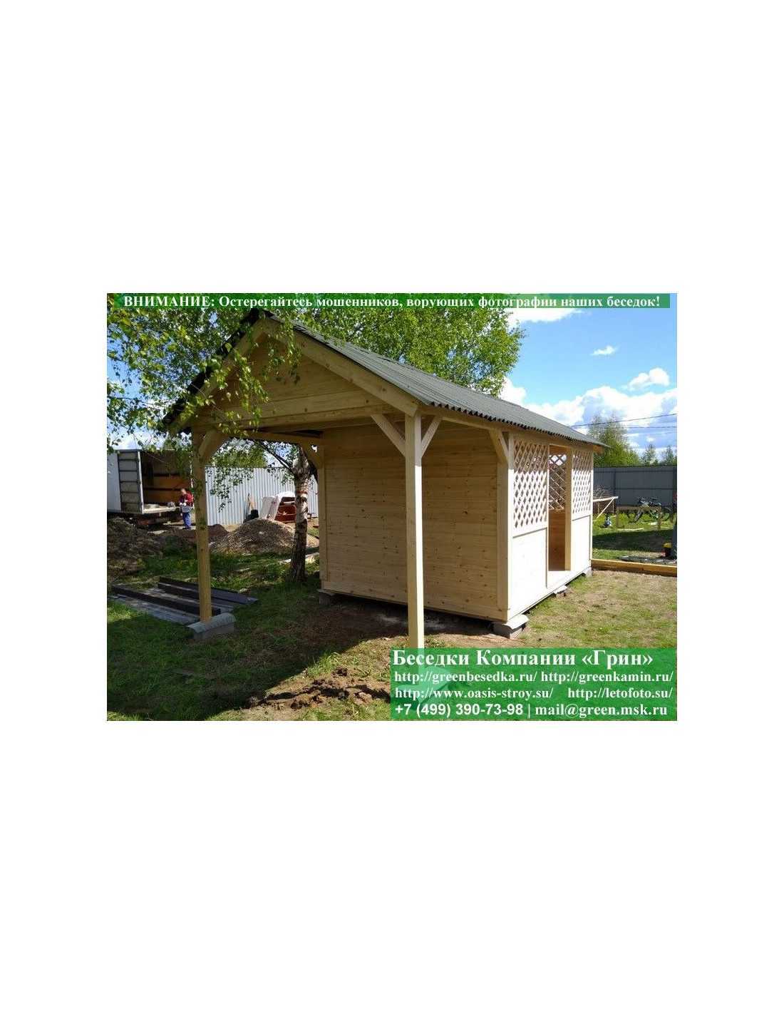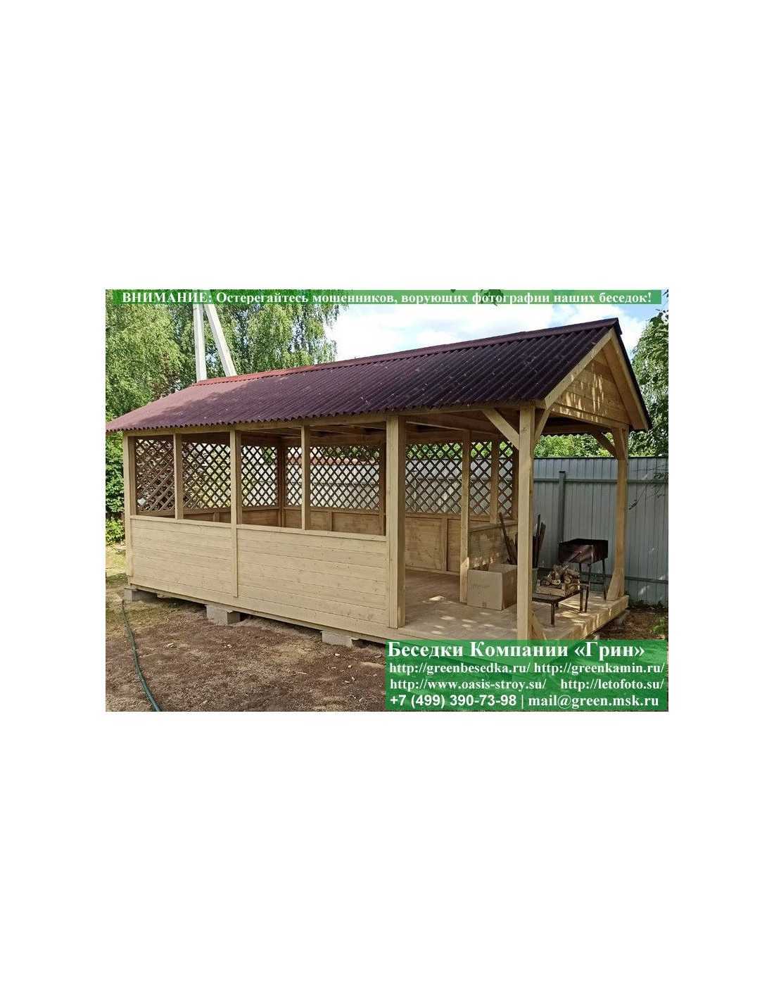 Деревянная садовая беседка для дачи, загородного дома, сада 'Домик с навесом 3х6'. Фото и цены. В интернет-магазине 'Грин Камин' вы можете купить надежную прямоугольную садовую беседку с навесом, зоной барбекю для дачи, отдыха 3х6 метров под ключ с монтажом в Рязани и Рязанской области. Изготовление и строительство простых прочных деревянных прямоугольных садовых беседок с навесом, мангальной зоной по готовым проектам размерами 3х6 метров возможно так же в Москве, Московской, Калужской, Тульской, Смоленской, Тверской, Ивановской, Орловской, Брянской, Ярославской, Костромской, Новгородской, Липецкой, Владимирской, Ленинградской и некоторых других областях.