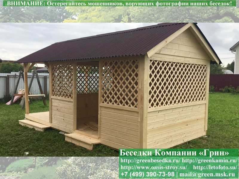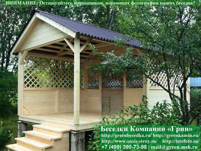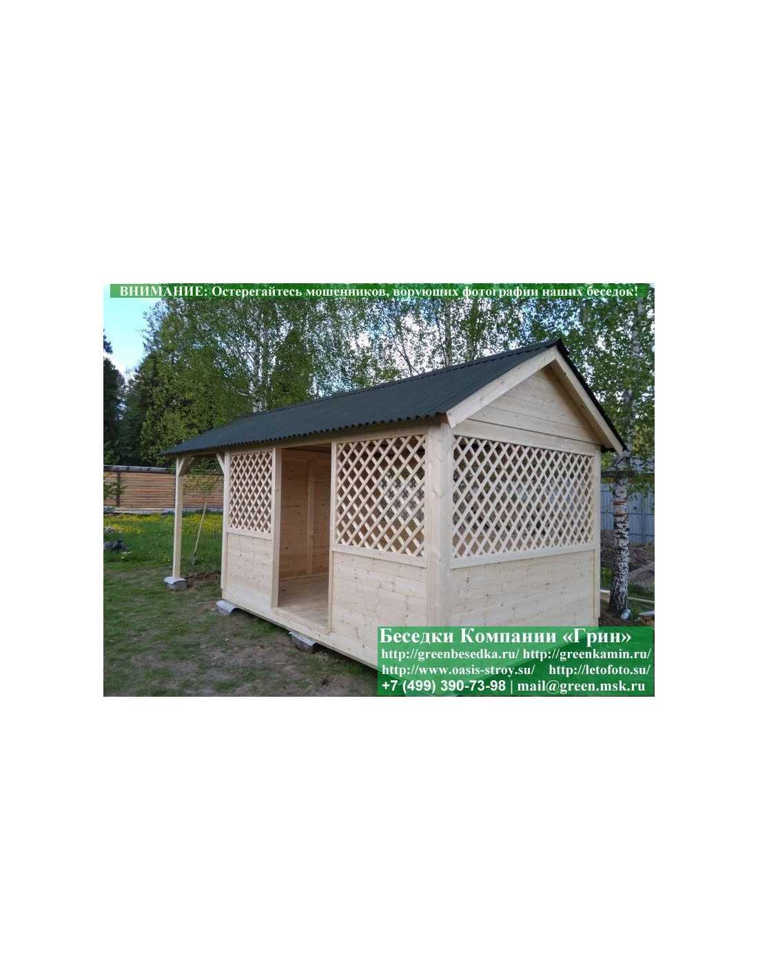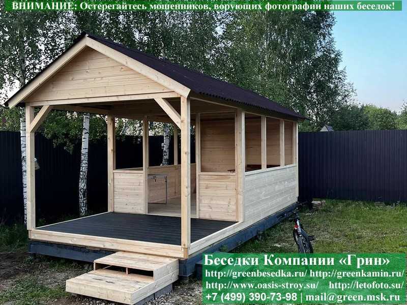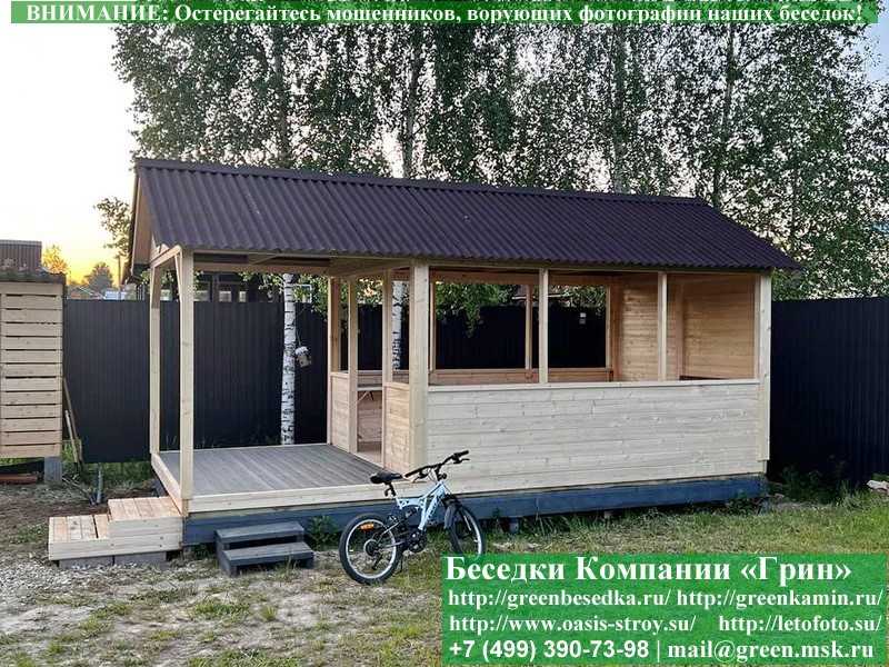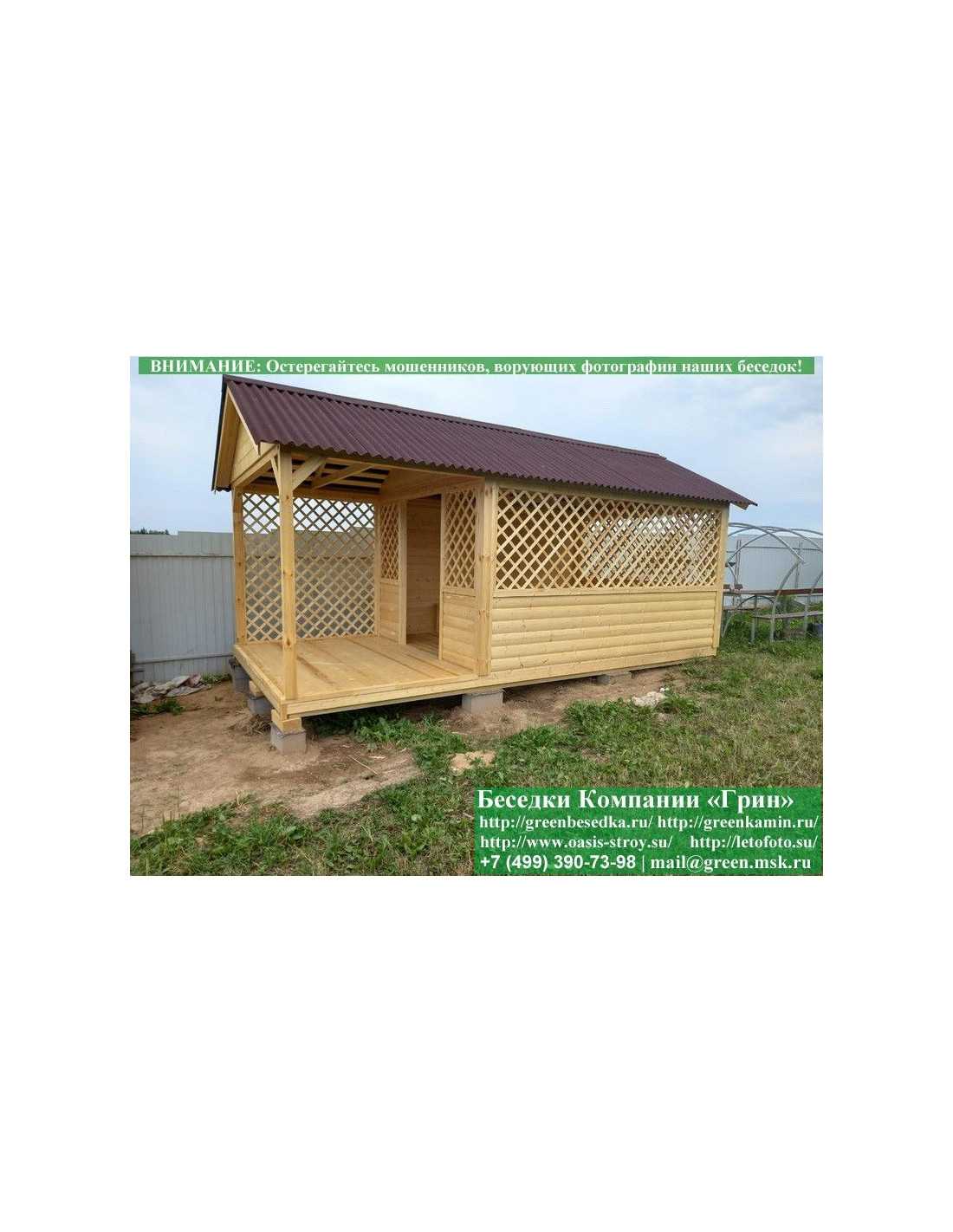 Деревянная садовая беседка для дачи, загородного дома, сада 'Домик с навесом 3х6'. Фото и цены. В интернет-магазине 'Грин Камин' вы можете купить надежную прямоугольную садовую беседку с навесом, зоной барбекю для дачи, отдыха 3х6 метров под ключ с монтажом в Рязани и Рязанской области. Изготовление и строительство простых прочных деревянных прямоугольных садовых беседок с навесом, мангальной зоной по готовым проектам размерами 3х6 метров возможно так же в Москве, Московской, Калужской, Тульской, Смоленской, Тверской, Ивановской, Орловской, Брянской, Ярославской, Костромской, Новгородской, Липецкой, Владимирской, Ленинградской и некоторых других областях.