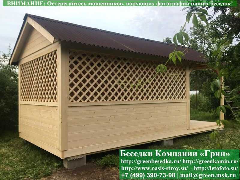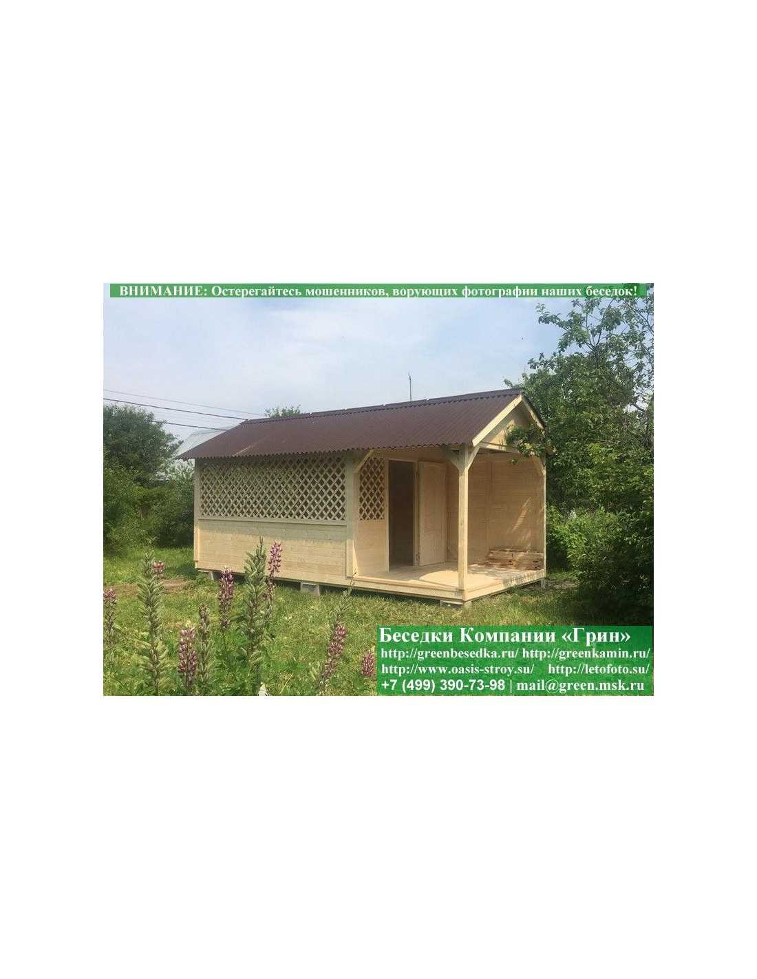 | Садовая беседка с навесом, мангальной зоной барбекю 3х6 метров. Глухая часть 3х4 метра. Глухая стенка 4 метра. Навес 2х3 метра. 2-х метровая сторона навеса глухая, закрыта имитацией бруса. Основание под кровлю — Обрешетка через 10 см: | 334 000 руб. |