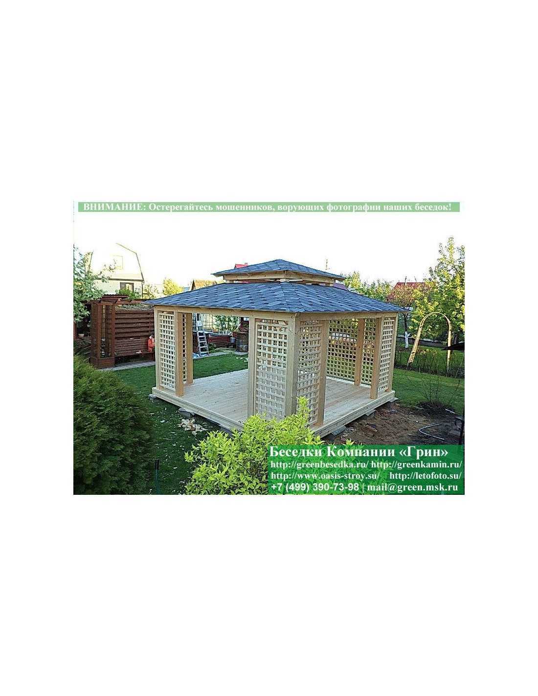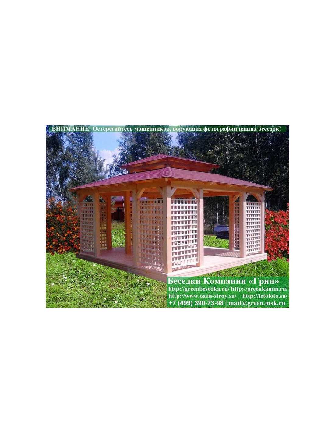 Беседка "Шатер для дачи 4,5х4,5" изготавливается из сосны, с двухъярусной крышей с воздушным клапаном. Крышу можно заменить на сплошную одноярусную. При строительстве беседок используется сухой материал камерной сушки. В качестве несущих стоек используется строганый брус 90х90 или 140х140 мм. На крышу беседки укладывается мягкая битумная черепица: Коричневых, Зеленых, Бордовых, Серых цветов. Стандартно изготавливается беседка открытая с 4-х сторон, но любую сторону можно закрыть перголой (решеткой) до потолка. Срок изготовления и монтажа беседки на участке 5-10 дней. Беседки поставляются в не крашеном виде. Возможна покраска беседок.