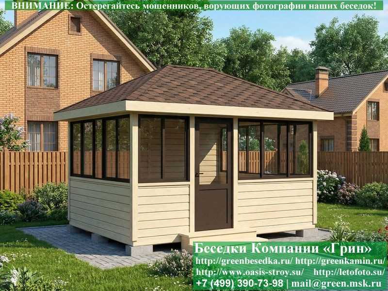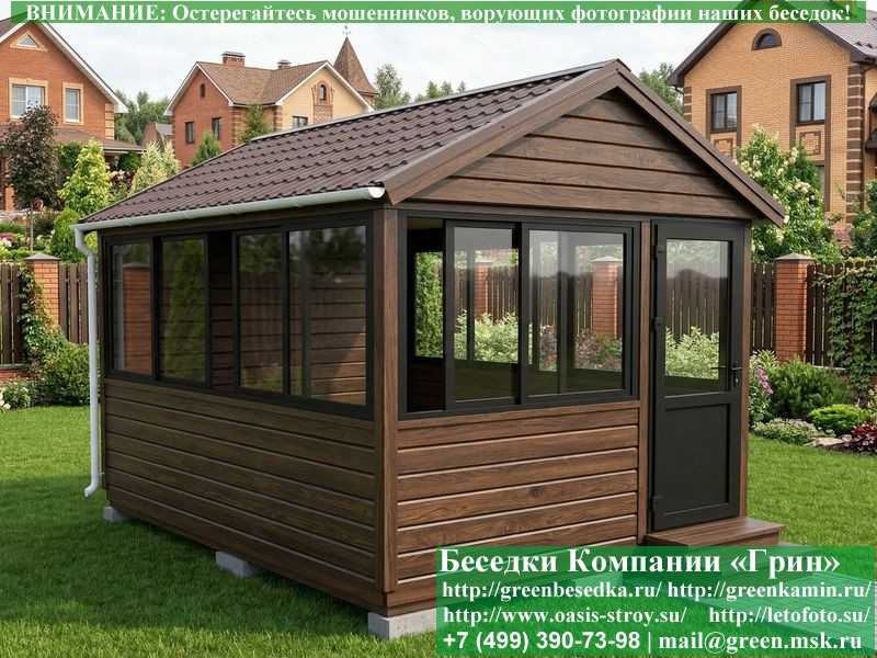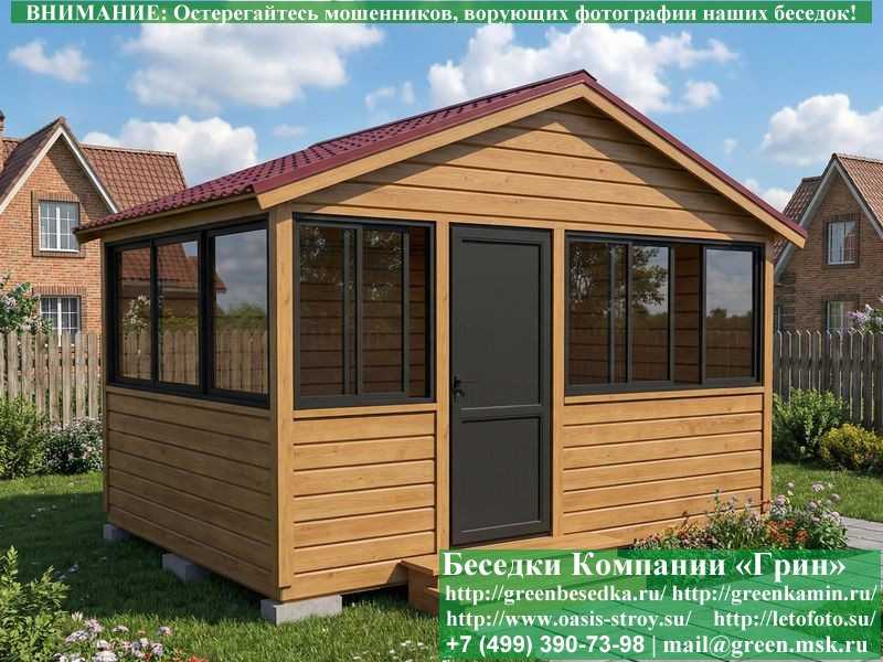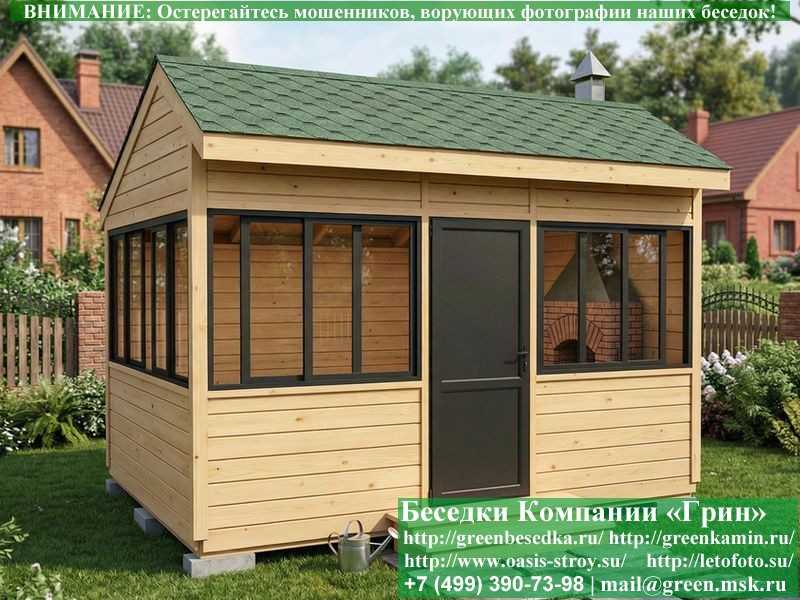 Застекленная беседка 3х4 метра изготавливается из сосны, по специальной каркасной технологии. При строительстве беседок используется сухое дерево камерной сушки. В качестве каркаса беседки используется  очень надежная Имитация бруса 17х140 мм. В отличие от вагонки, она не гнется, не набухает и не идет трещинами. Имитацию бруса можно заменить на блокхаус (имитация бревна). Используется усиленная конструкция крепления стенок. В качестве несущих стоек используется строганый брус. По углам дополнительно устанавливается брус 90х90 мм. На пол кладется толстая сухая строганая доска 35 мм (не шпунт). Пол обрабатывается антисептиком. Половую доску можно заменить на шпунтованную 36 мм или террасную доску ДПК. В беседку устанавливаются однорамные раздвижные алюминиевые окна фирмы "Русокон". Количество застекленных сторон и количество открывающихся окон обговаривается дополнительно. Устанавливается железная или алюминиевая дверь. Беседки изготавливаются с односкатной, двухскатной, четырехскатной крышей. На крышу кладется металлочерепица, мягкая черепица или профлист: Коричневых, Зеленых, Бордовых, Серых цветов. Срок изготовления и установки беседки на участке составляет 10-14 дней (срок изготовление алюминиевых окон). Беседки поставляются в не крашеном виде. Возможна покраска беседок в цеху или полная обработка антисептиком. Дополнительно предлагаем установку в деревянные беседки с алюминиевыми окнами недорогих безопасных быстровозводимых печей-барбекю, установка в течение дня, или более дорогих и сложных комплексов-барбекю и мангалов-барбекю из кирпича.