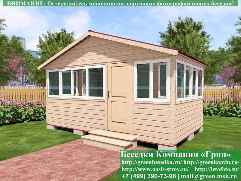 Застекленная беседка 3х5 метров изготавливается из сосны, по специальной каркасной технологии. При строительстве беседок используется сухой материал камерной сушки. В качестве каркаса беседки используется  очень надежная имитация бруса 17х140 мм. В отличие от вагонки, она не гнется, не набухает и не идет трещинами. Используется усиленная конструкция крепления стенок. В качестве несущих стоек используется строганый брус, по углам 90х90 мм. В качестве пола используется сухая строганая доска 35 мм. В беседку устанавливаются однокамерные пластиковые окна фирмы "Века". Количество застекленных сторон и количество открывающихся окон обговаривается. Стандартно устанавливается недорогая сплошная деревянная филенчатая дверь. Дверь закупается в Лемана-Про. Гарантии не подлежит. Деревянную дверь можно заменить на более надежную металлическую или пластиковую дверь. Срок изготовления и установки беседки на участке составляет 10-14 дней (изготовление пластиковых окон). Беседки поставляются в не крашеном виде. Возможна покраска беседок или обработка антисептиком\.
